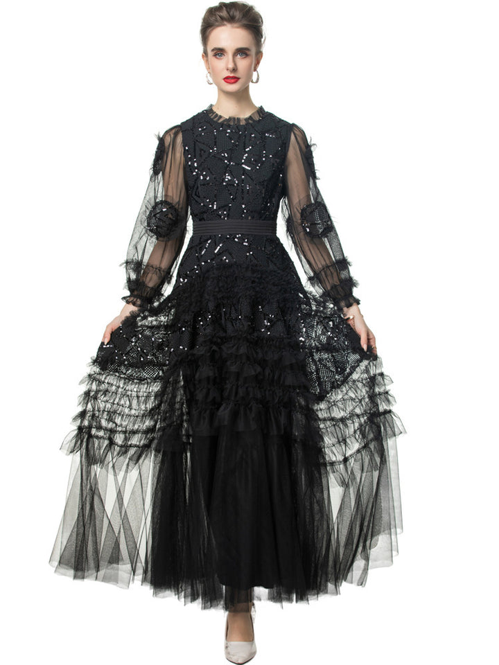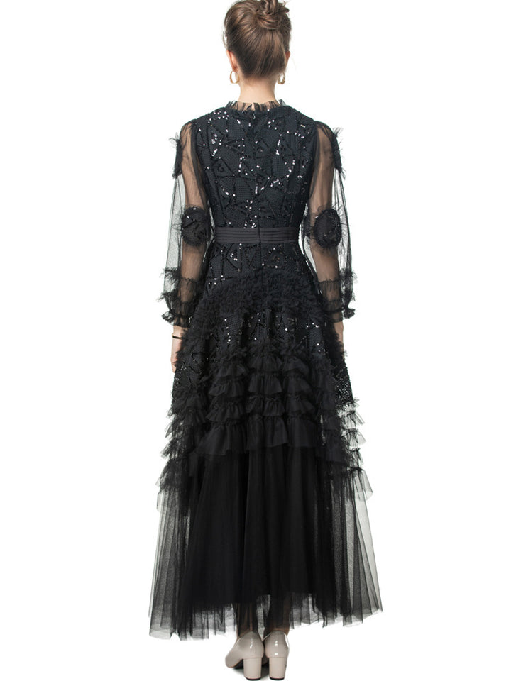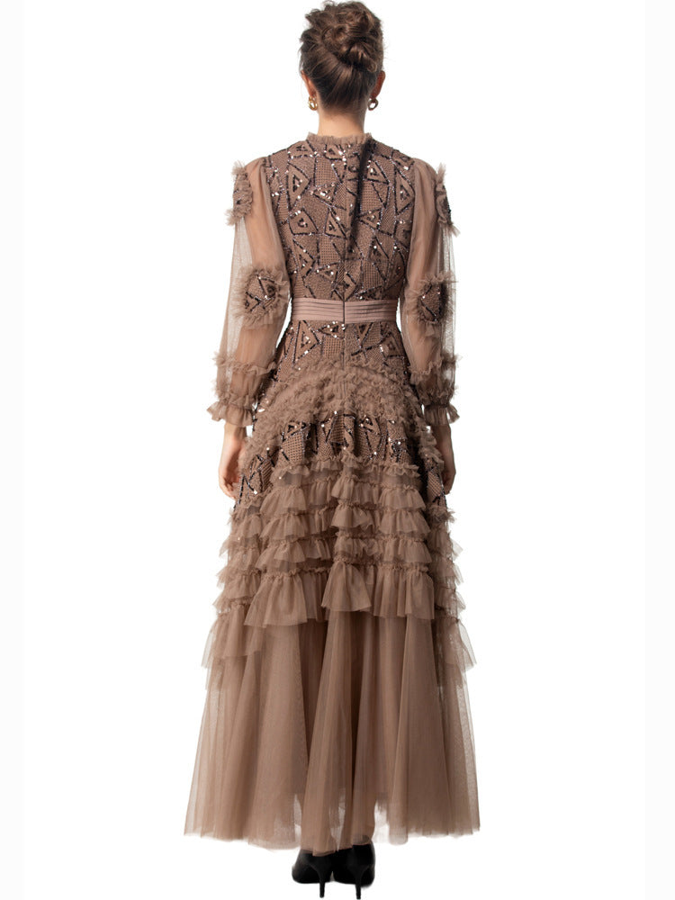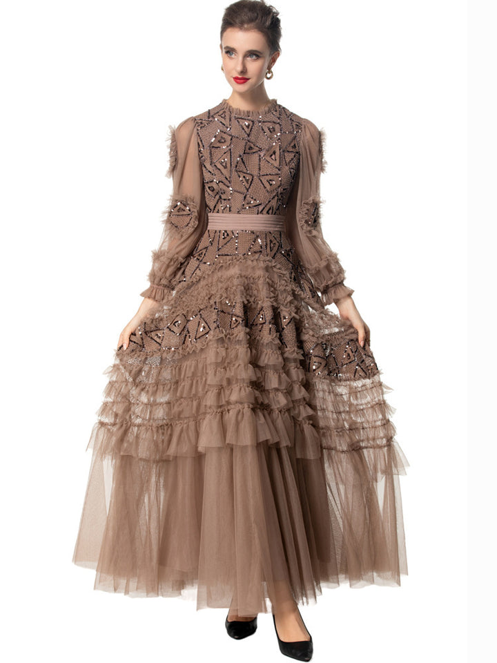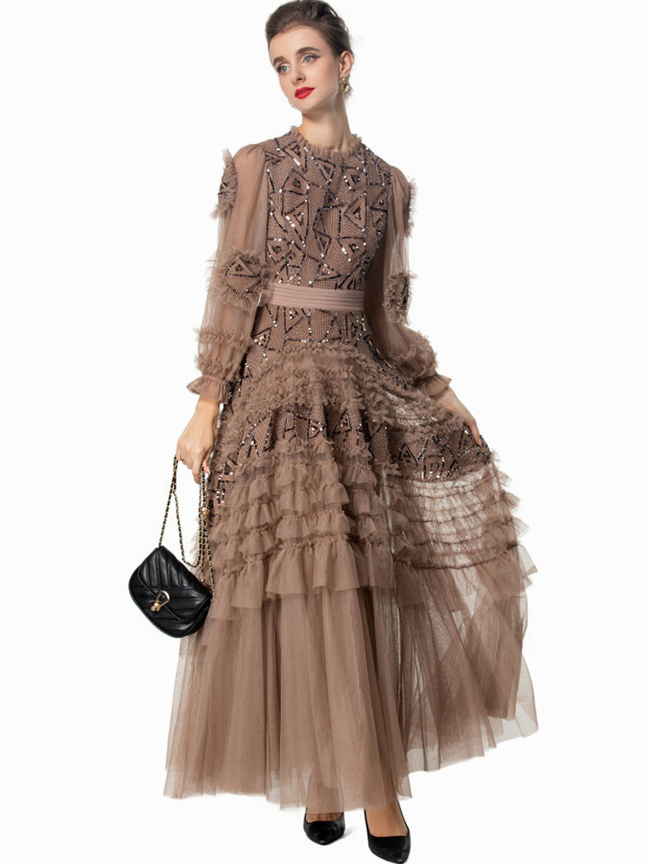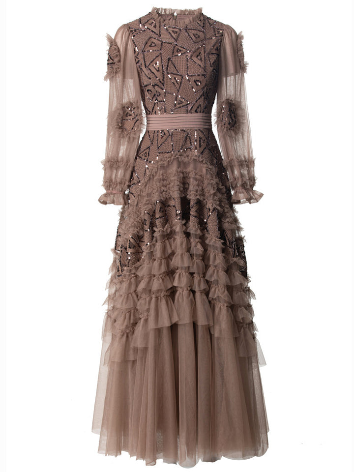 A striking gown in deep garnet red, featuring bold geometric sequin embroidery, sheer puffed sleeves, and cascading tulle ruffle tiers. The defined waistline and voluminous skirt bring dramatic flair—ideal for grand occasions and evening elegance.