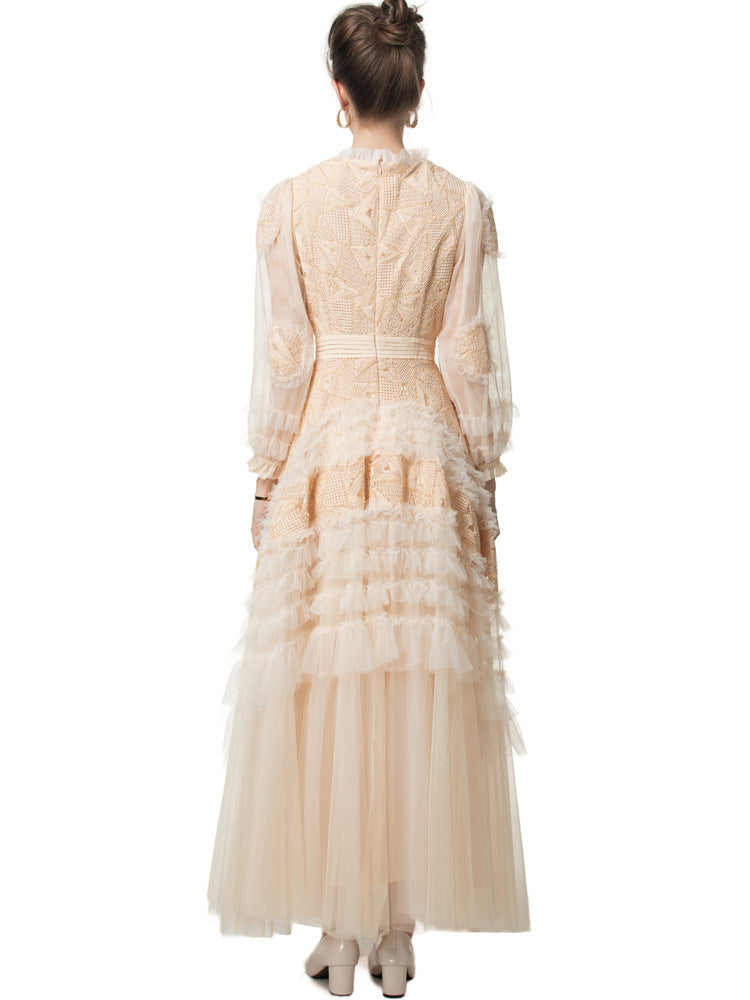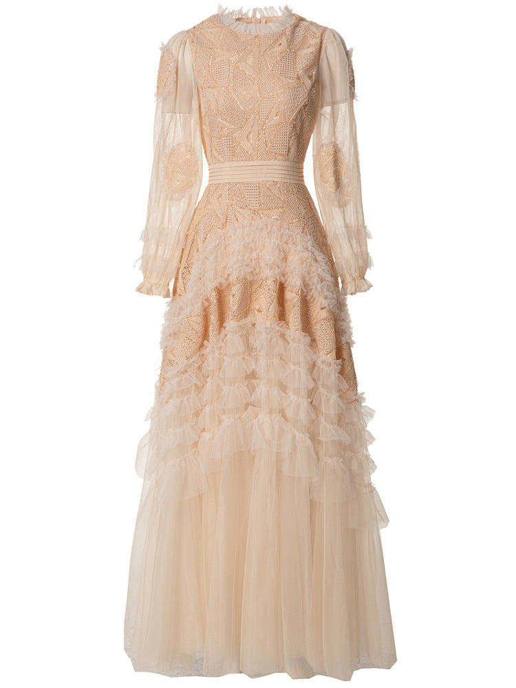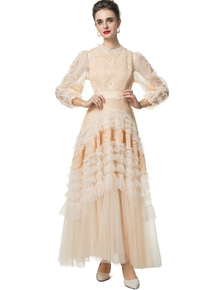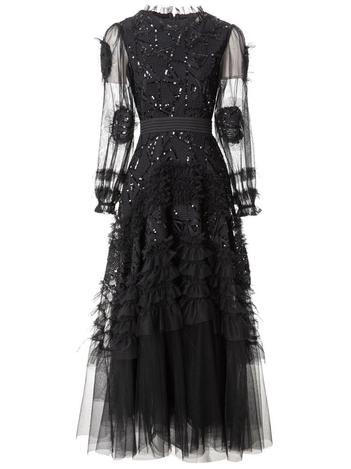 sequined tulle gown with geometric embroidery and puff sleeves – GARNET