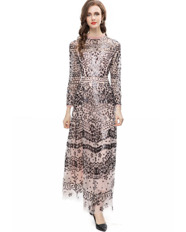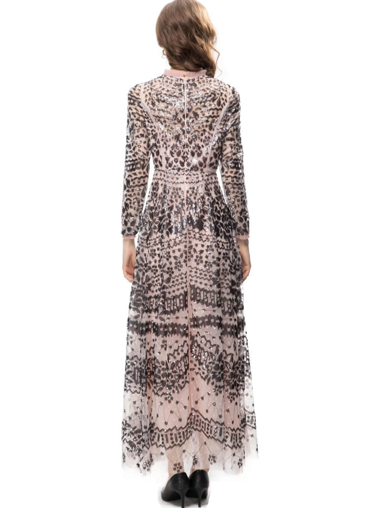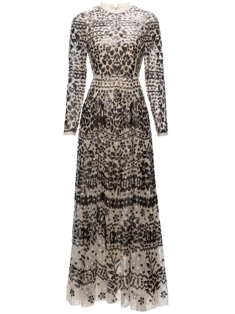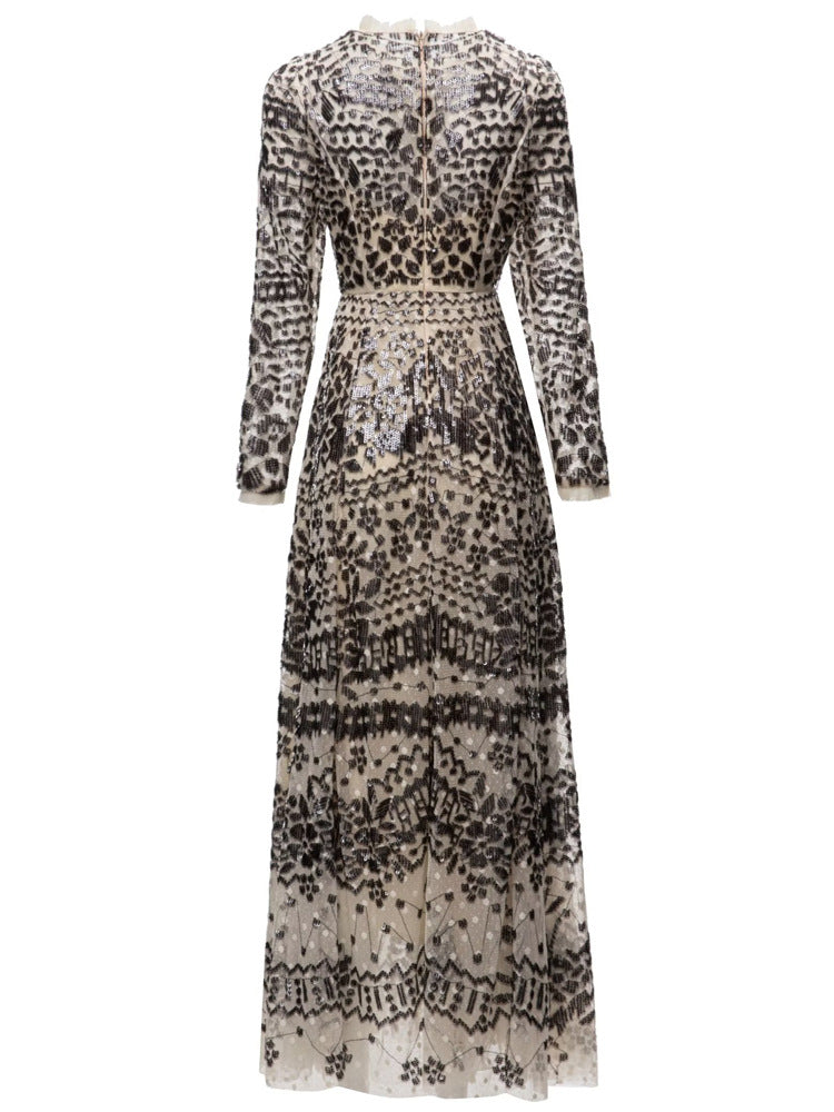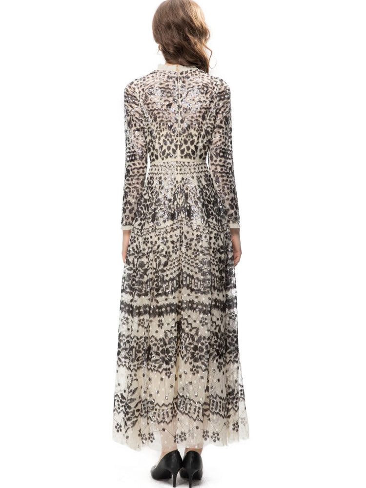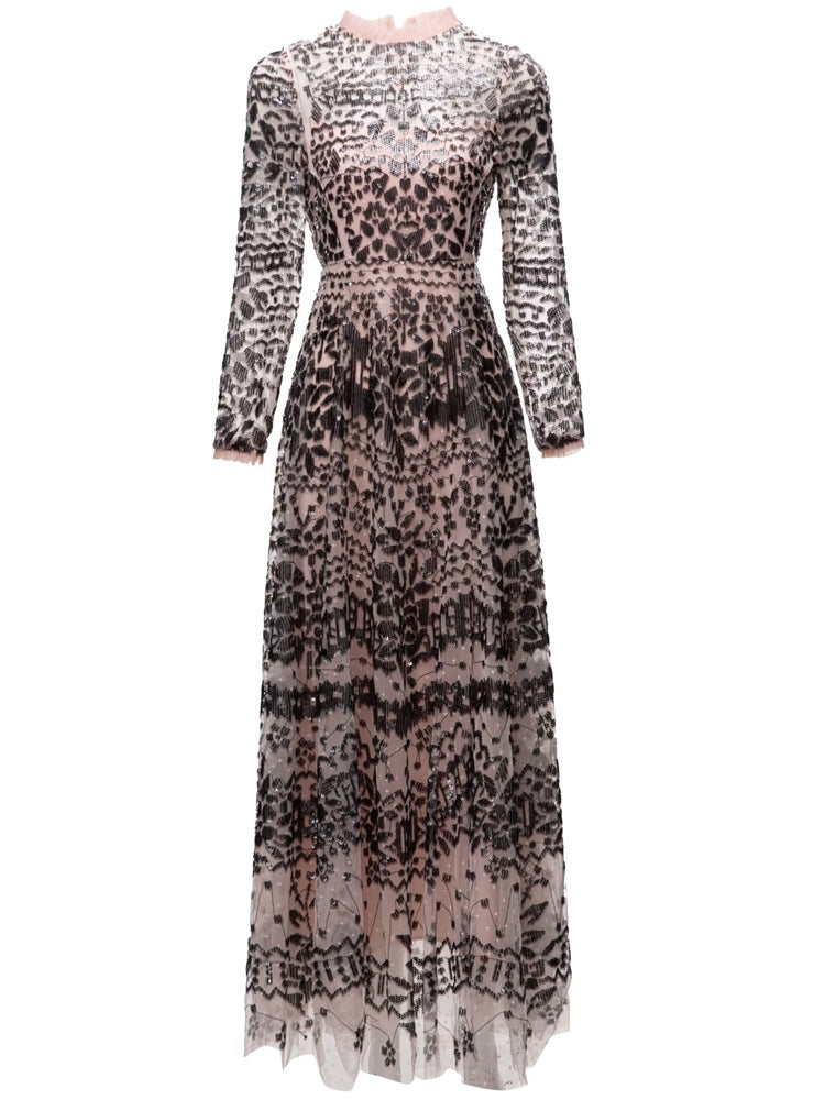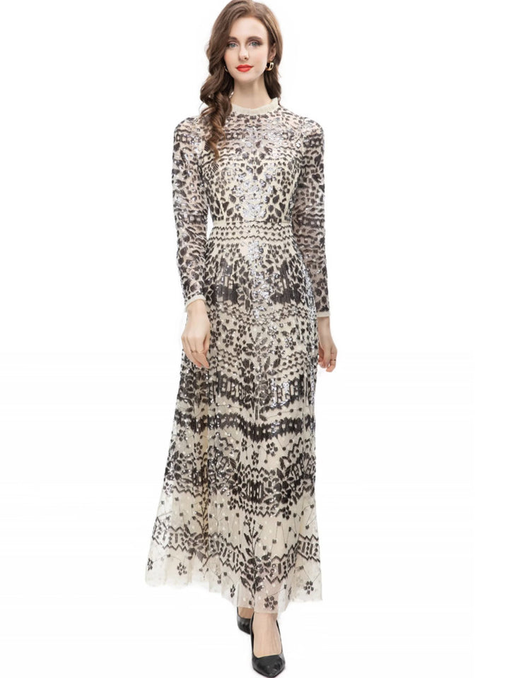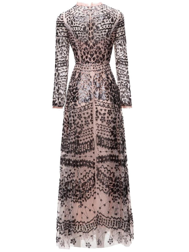 An elegant tulle dress embellished with delicate embroidery and shimmering sequin details. Designed with long, fitted sleeves and a high neckline, this maxi dress combines elegance and modern charm for a stunning look.