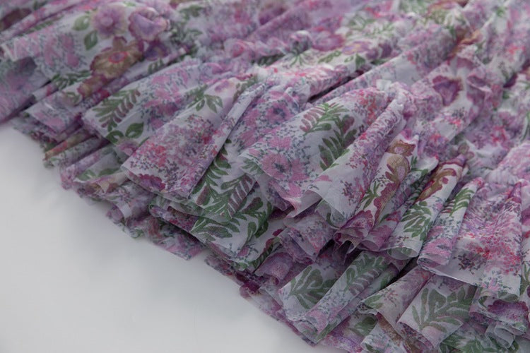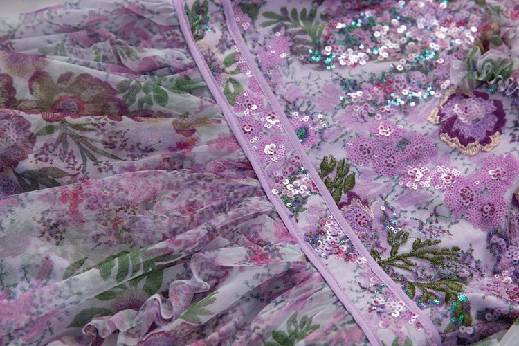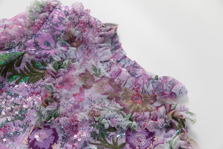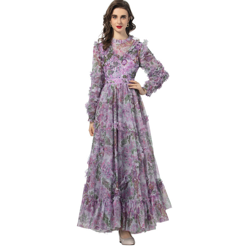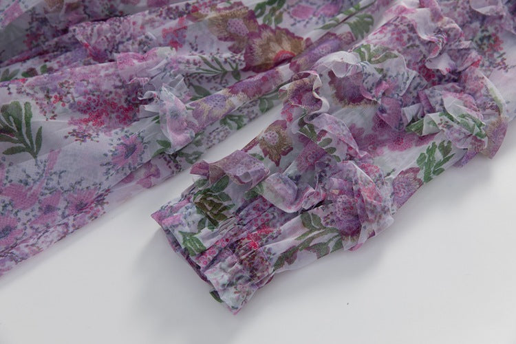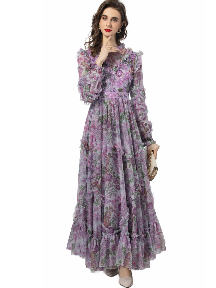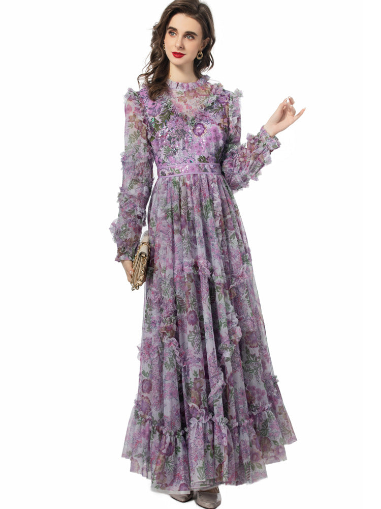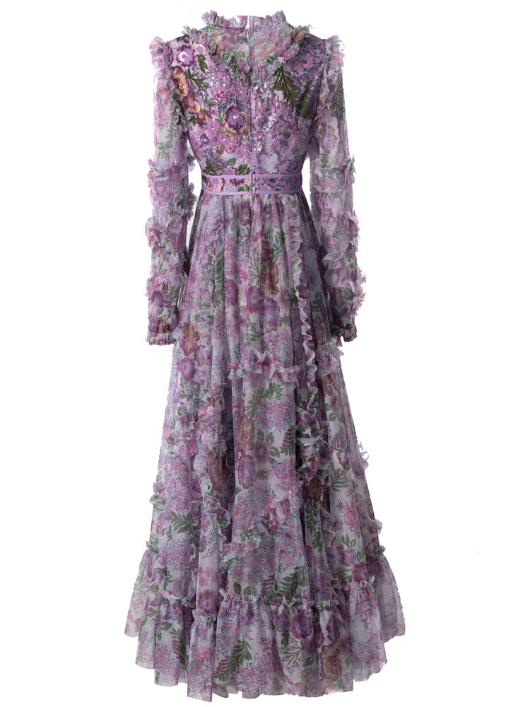 A romantic long dress made of sheer mesh fabric with a floral print, featuring delicate ruffled edges and a cinched waist. Its delicate design makes it perfect.