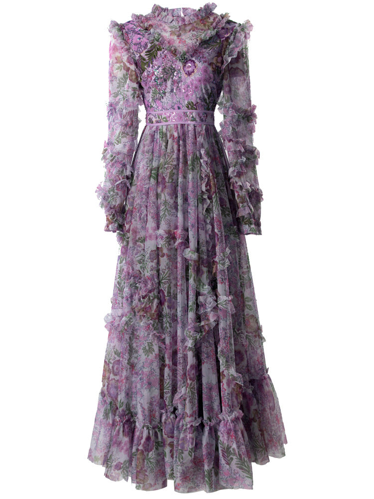 long sleeve floral mesh gown with ruffle details - VIOLED