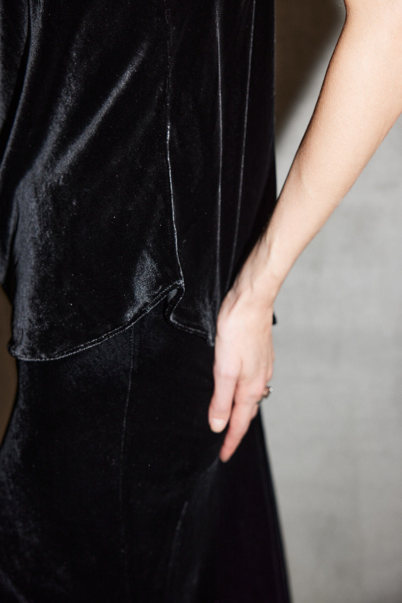 An elegant velvet cami top featuring a soft draped cowl neckline and delicate spaghetti straps. Designed with a fluid silhouette that flatters the body, this piece adds a touch of refined glamour—perfect for evening looks, layering, or chic minimal styling.
