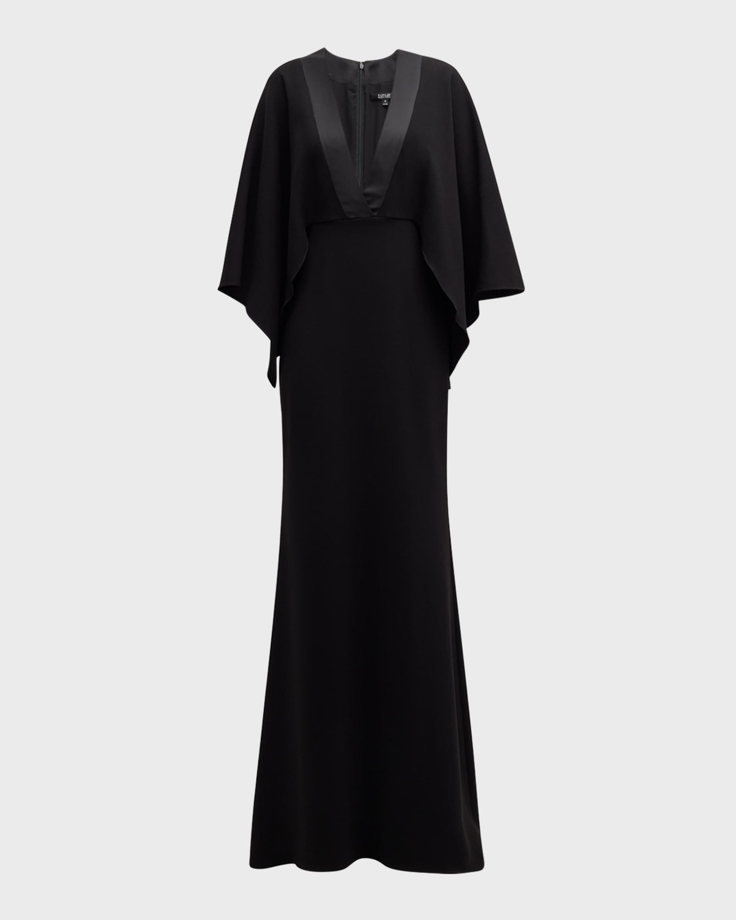 Striking black gown featuring a plunging satin-trim neckline and fluid cape-style sleeves that drape elegantly over the shoulders—an embodiment of modern elegance and timeless allure.