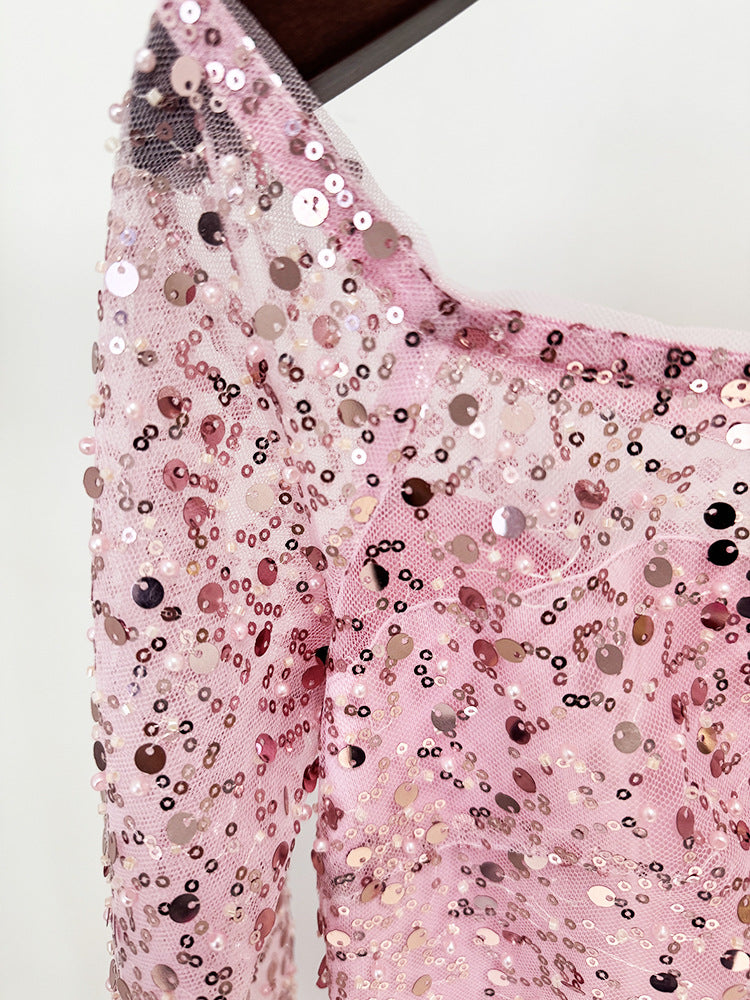 Plissiertes Oberteil mit ausgestellten Ärmeln und Maxirock-Set mit Taillengürtel – Rosiny