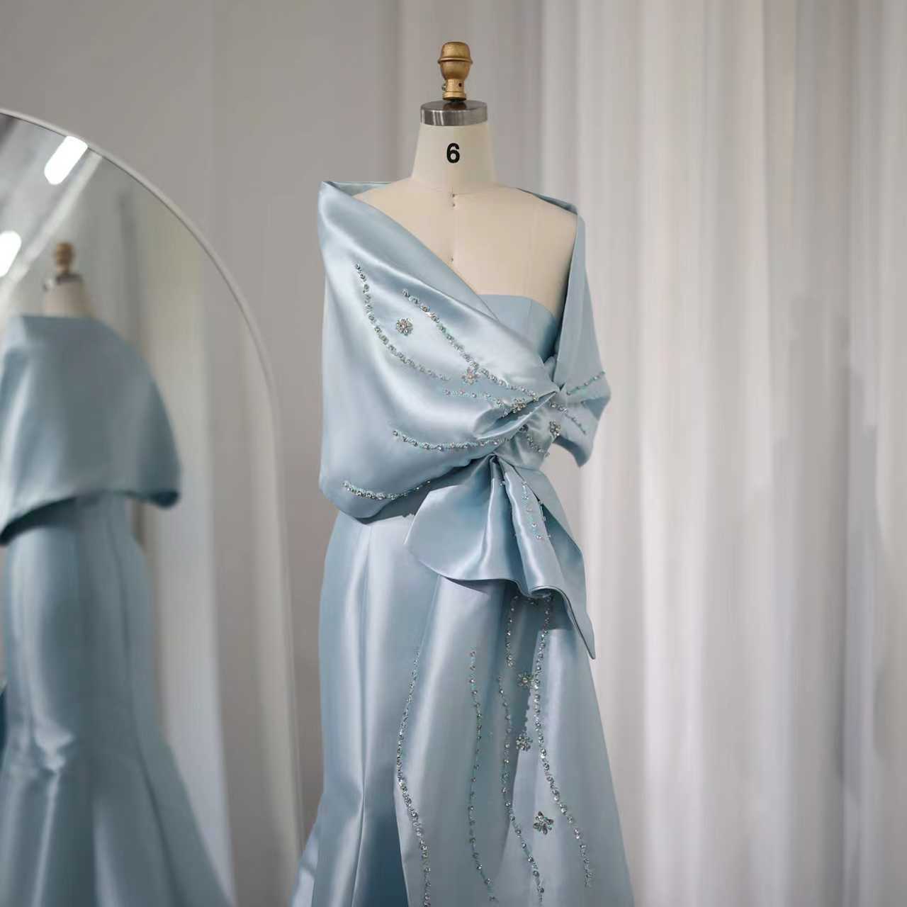 Refined ice-blue satin mermaid gown featuring a strapless neckline, elegantly draped embellished overlay tied in a statement bow, and a graceful floor-length silhouette.