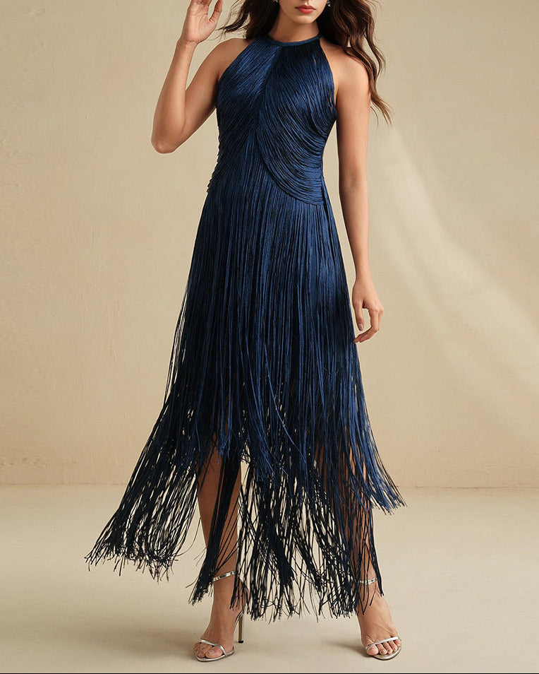 Glamorous bronze halter gown featuring a pleated metallic texture and cascading fringe detailing for fluid movement. Designed with a figure-hugging silhouette and front slit, this piece exudes effortless sophistication and red-carpet allure.