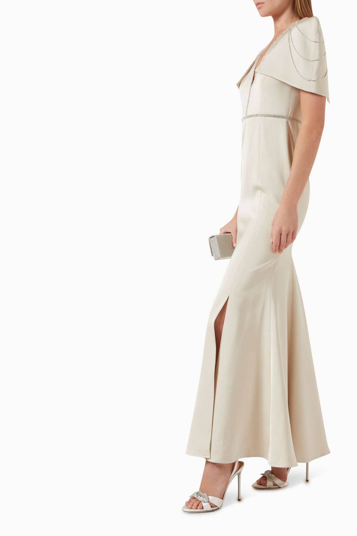 structured shoulder gown with crystal trim – IVORY