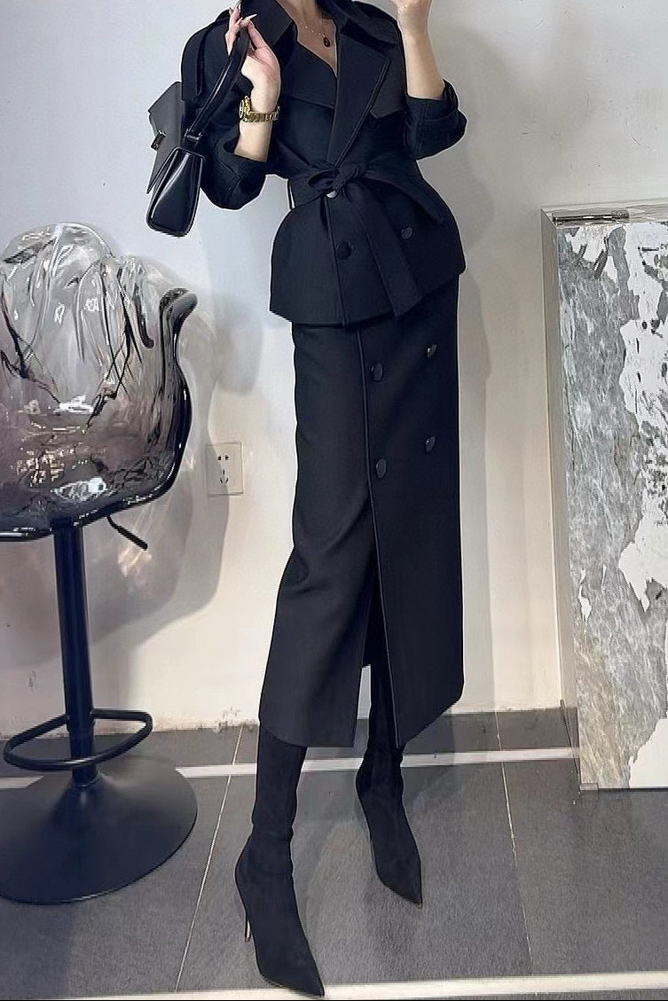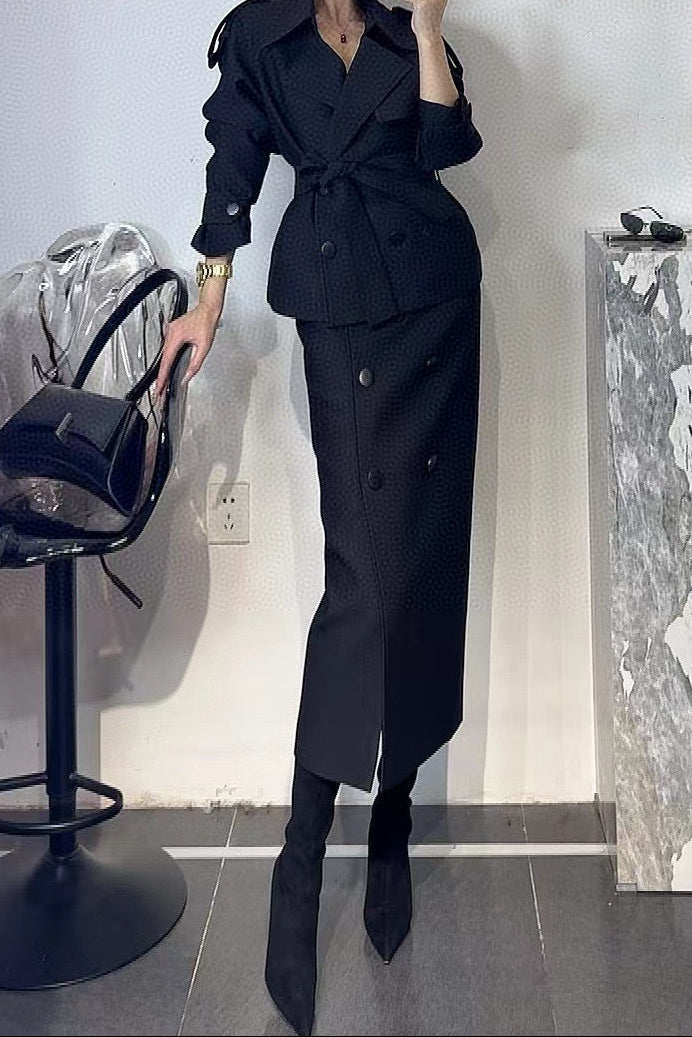 A refined trench-inspired two-piece set featuring a structured belted blazer with sculpted shoulders and a matching midi skirt detailed with double-breasted buttons and a front slit. Designed in a warm beige tone that blends elegance with modern power dressing—perfect for elevated daytime looks or polished evening outings.
