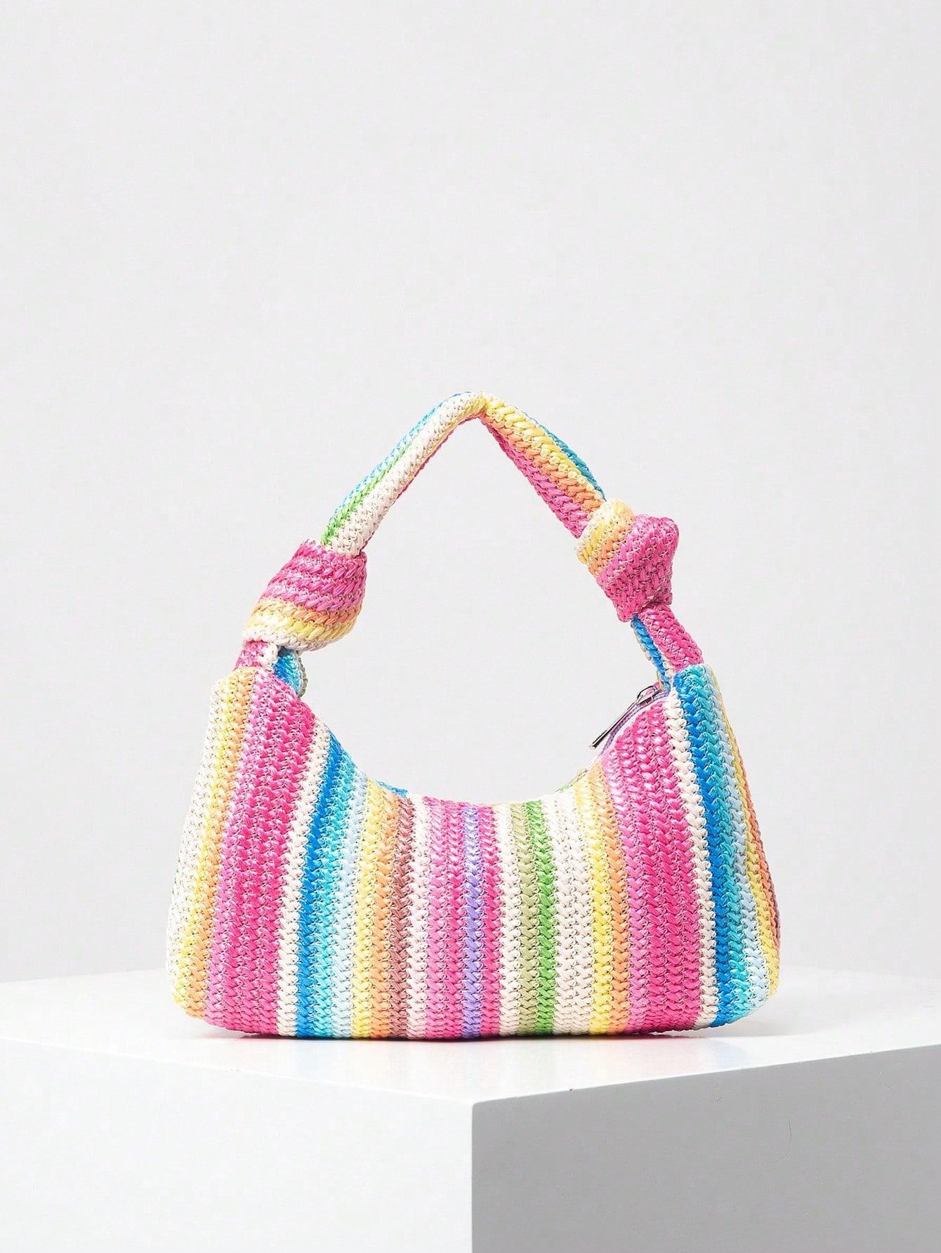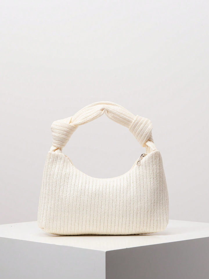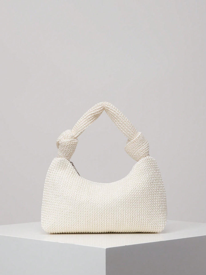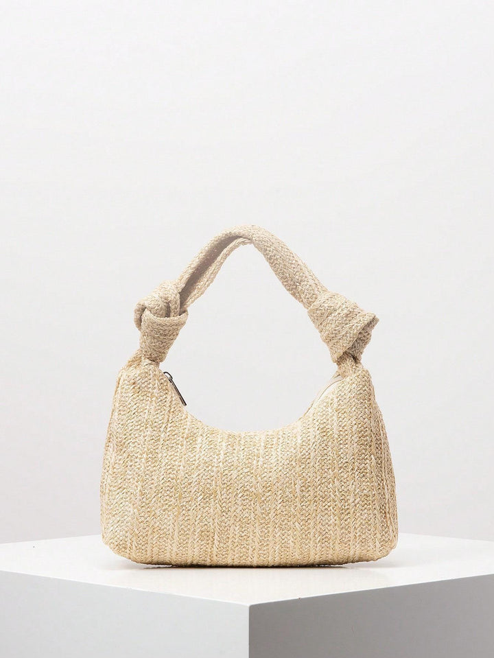 A shoulder bag crafted from woven raffia fabric, featuring a soft knotted handle and a curved design for a stylish look. Lightweight and spacious.