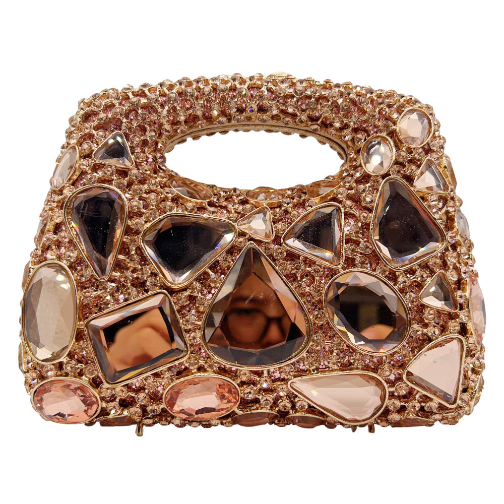 A stunning clutch bag with a structured design, embellished with a vibrant, multi-colored gemstone cluster that catches the eye with every move. Featuring a sleek handle for easy carrying and a stylish clasp, this sparkling bag adds a touch of elegance and color to your look.