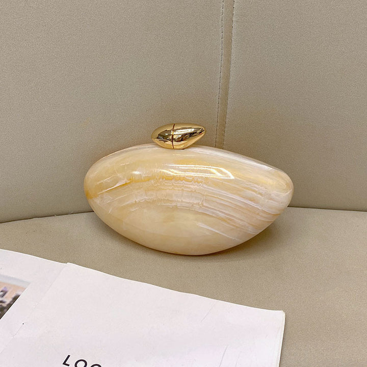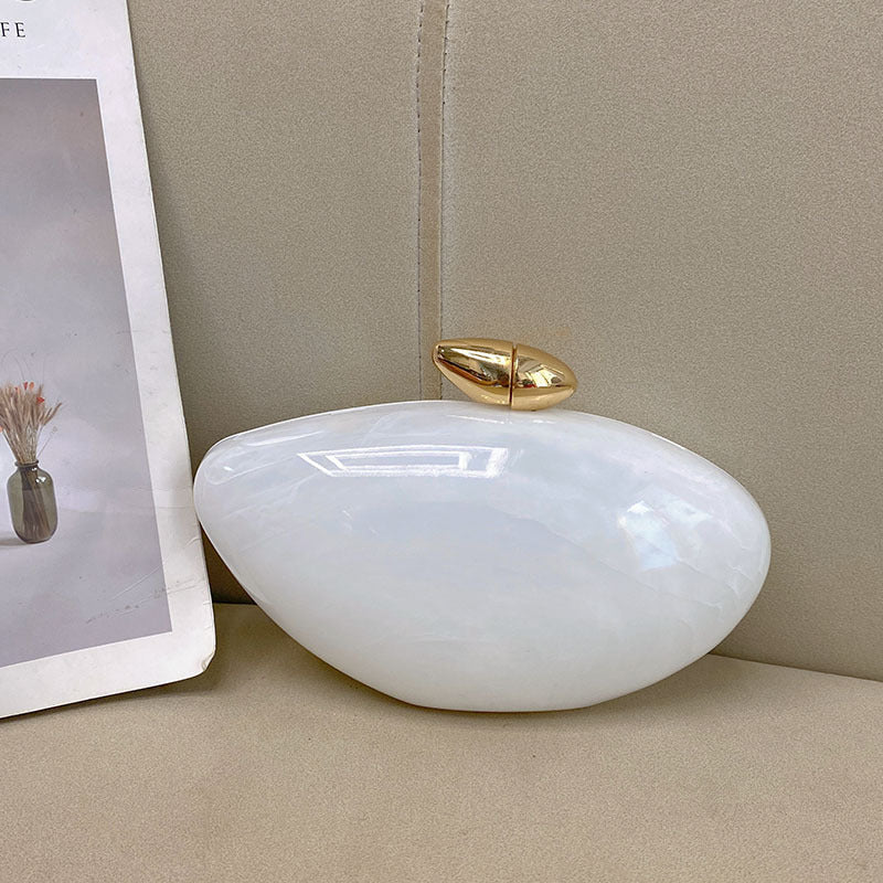 This elegant bag features a rounded shape with a sophisticated gold clasp. Made from glossy material, it radiates a chic appeal, perfect for evening outings or formal occasions. Available in various colors to suit your style. Material : Acrylic Bag size: 22*12*7.5 Packing size: 24*14*8.5 Weight: 483