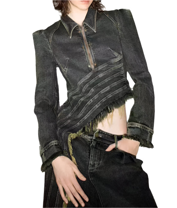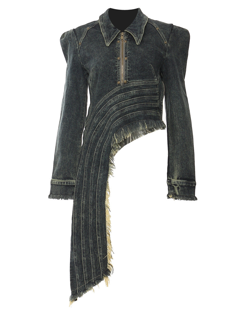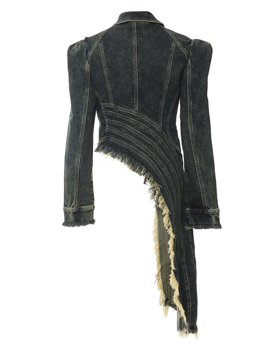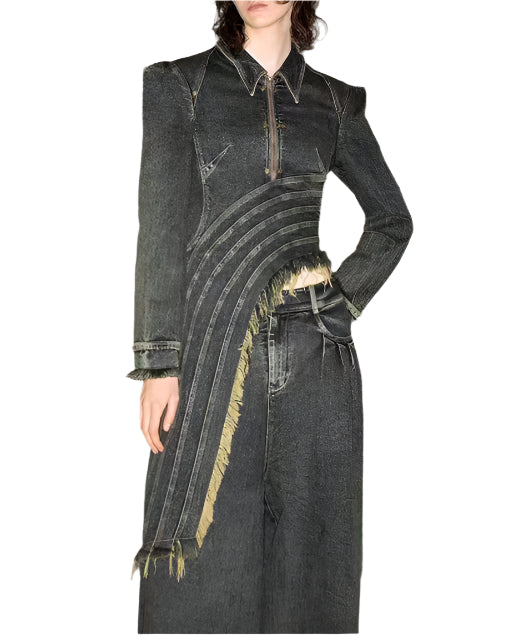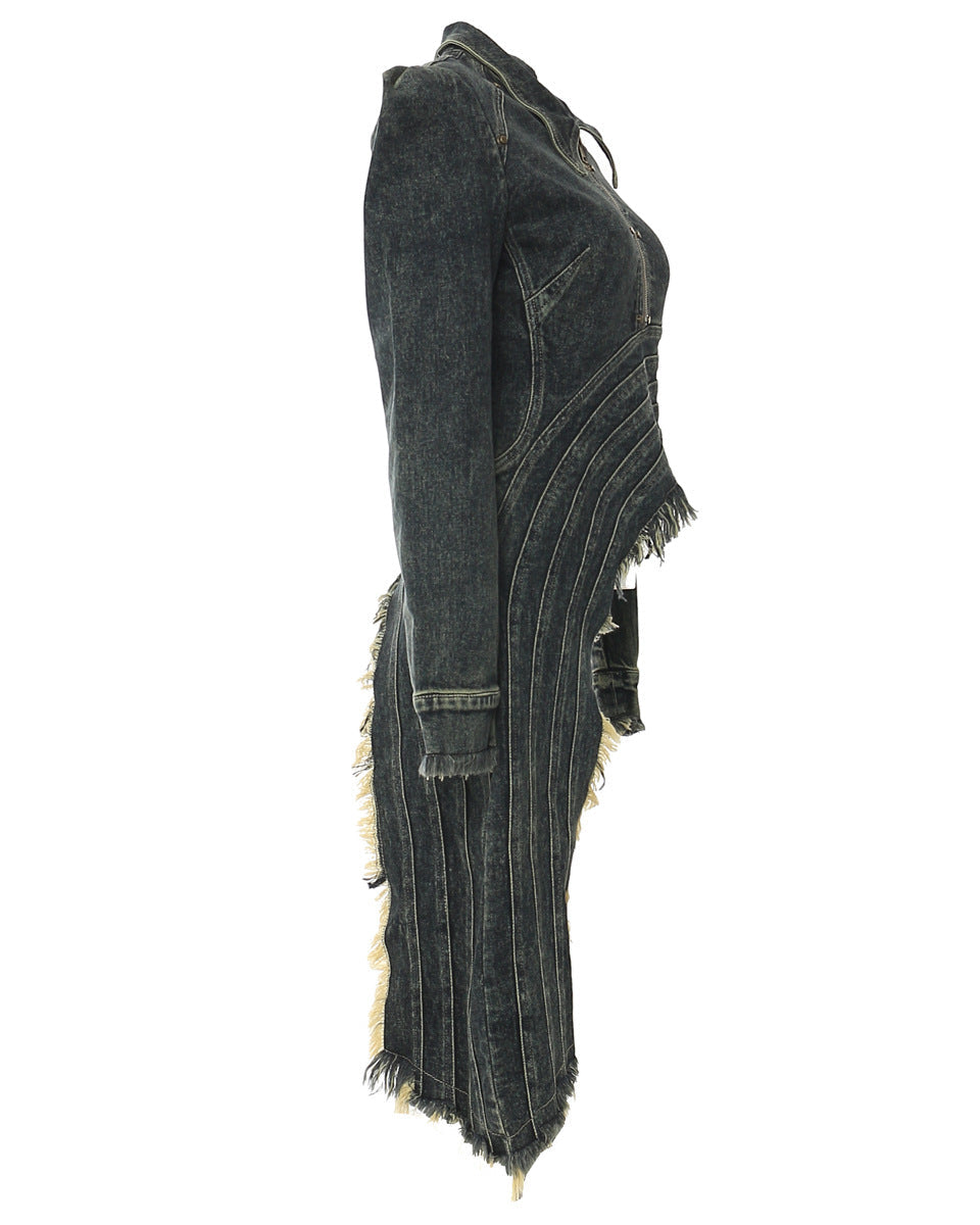 Dieser auffällige Blazer mit Farbblock-Muster vereint feine Schneiderkunst mit einem lässigen, modernen Touch. Er verfügt über eine marineblaue Baumwollmischung im oberen Bereich und verschiedene Blautöne im Denim-Rock, was einen mutigen, aber ausgewogenen Look schafft. Das strukturierte Blazer-Design strahlt einen schicken und raffinierten Touch aus, während der lockere Denim-Rock einen Hauch von Komfort und Spaß hinzufügt. Er verfügt über klassische Knöpfe und praktische Vordertaschen.