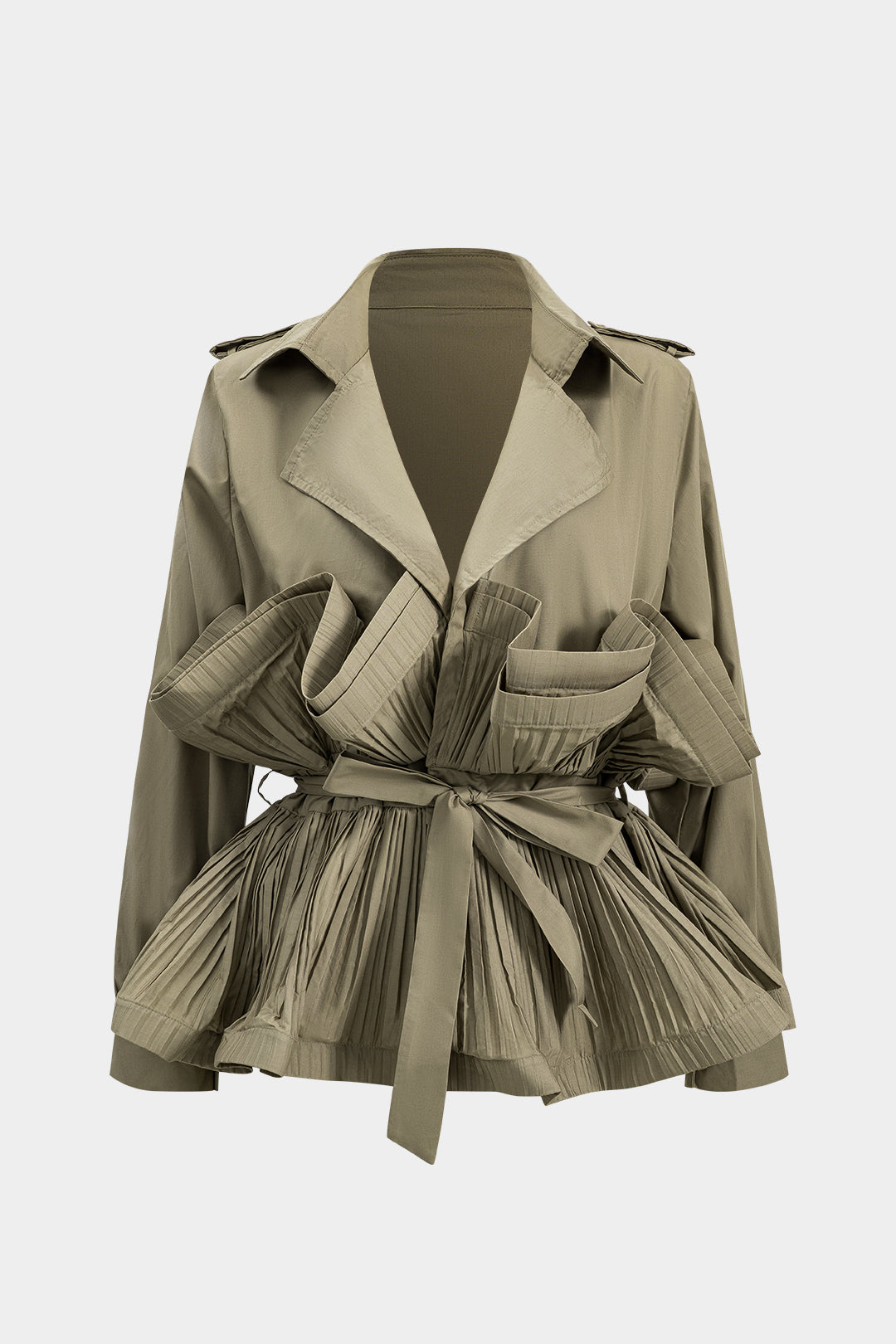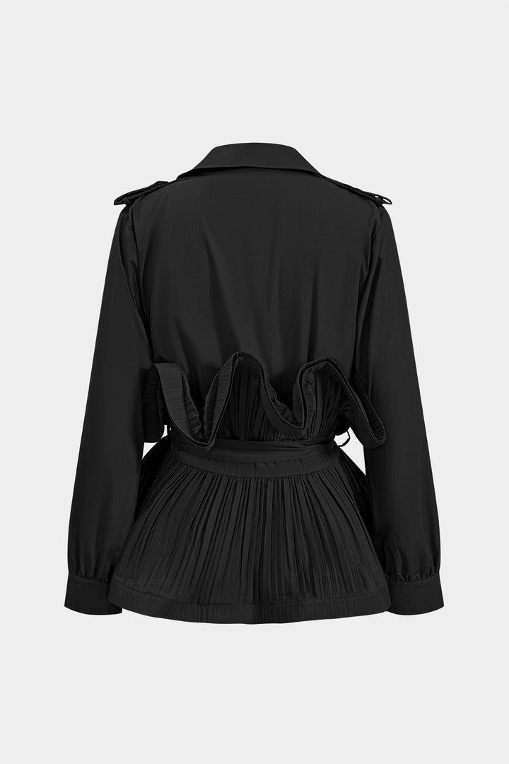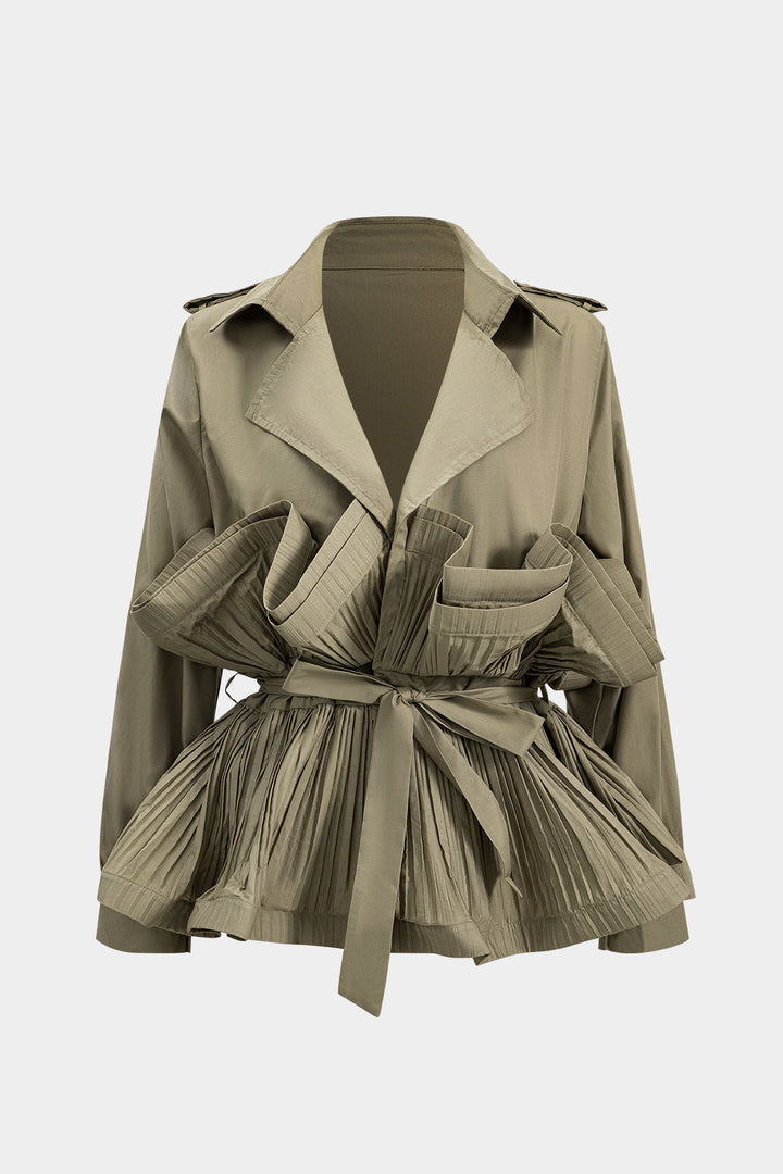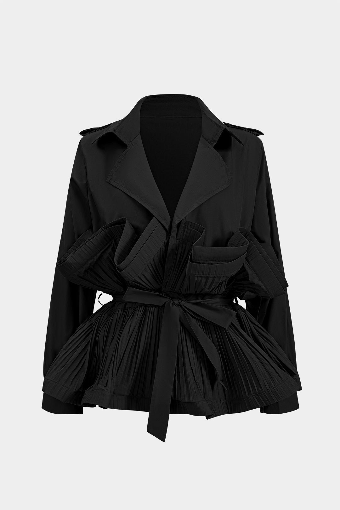 A modern reinterpretation of the classic trench jacket, featuring dramatic pleated detailing at the waist that creates a sculpted, peplum-inspired silhouette. Designed with a sharp lapel collar, long sleeves, and a self-tie belt to define the waist, this piece balances structure with fluid movement. Bold yet refined, it’s perfect for elevated daywear, fashion-forward layering, or statement outerwear looks with architectural elegance.