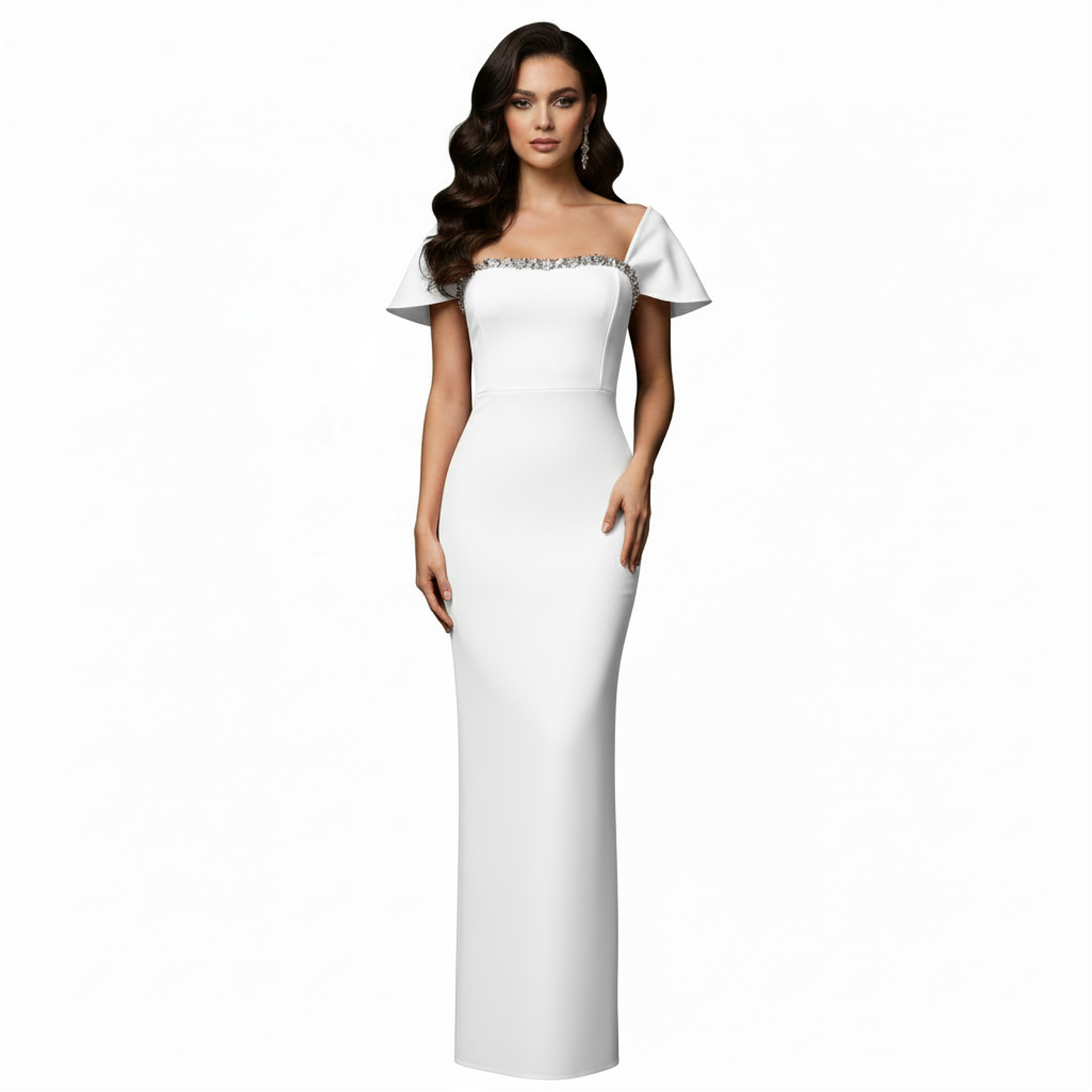 A sleek off-shoulder column dress in a rich royal blue tone, finished with a refined crystal-embellished neckline. Designed to sculpt the silhouette with clean lines and a timeless elegance—perfect for formal evenings and special occasions.