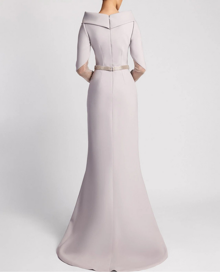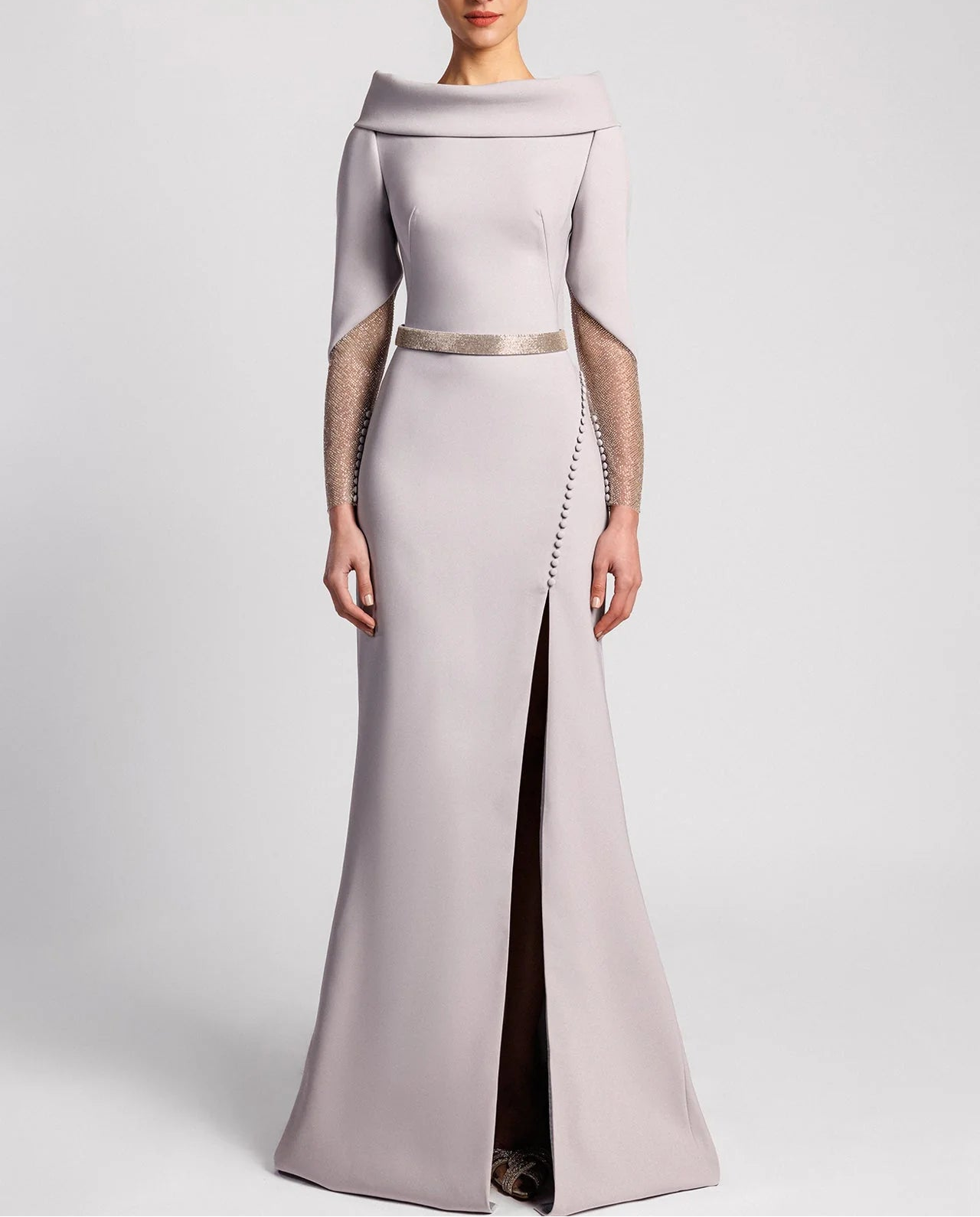 Off-shoulder gown with sheer embellished sleeves and slit – SELVI