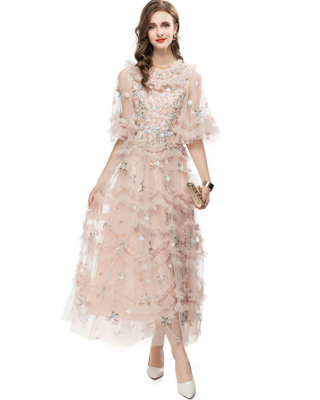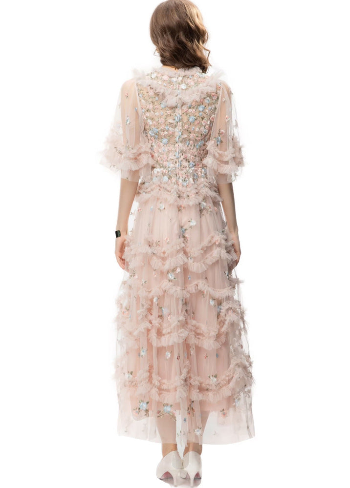 A delicate and romantic pink tulle dress, adorned with delicate floral embroidery and cascading ruffles. It features a sheer overlay, puffy sleeves, and a soft A-line silhouette.
