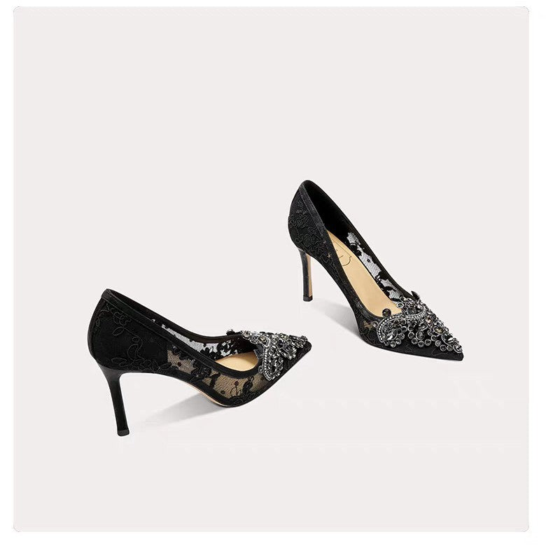 Elegant lace-up stiletto pumps featuring a pointed toe embellished with intricate crystal embellishments - perfect for special occasions and glamorous looks.