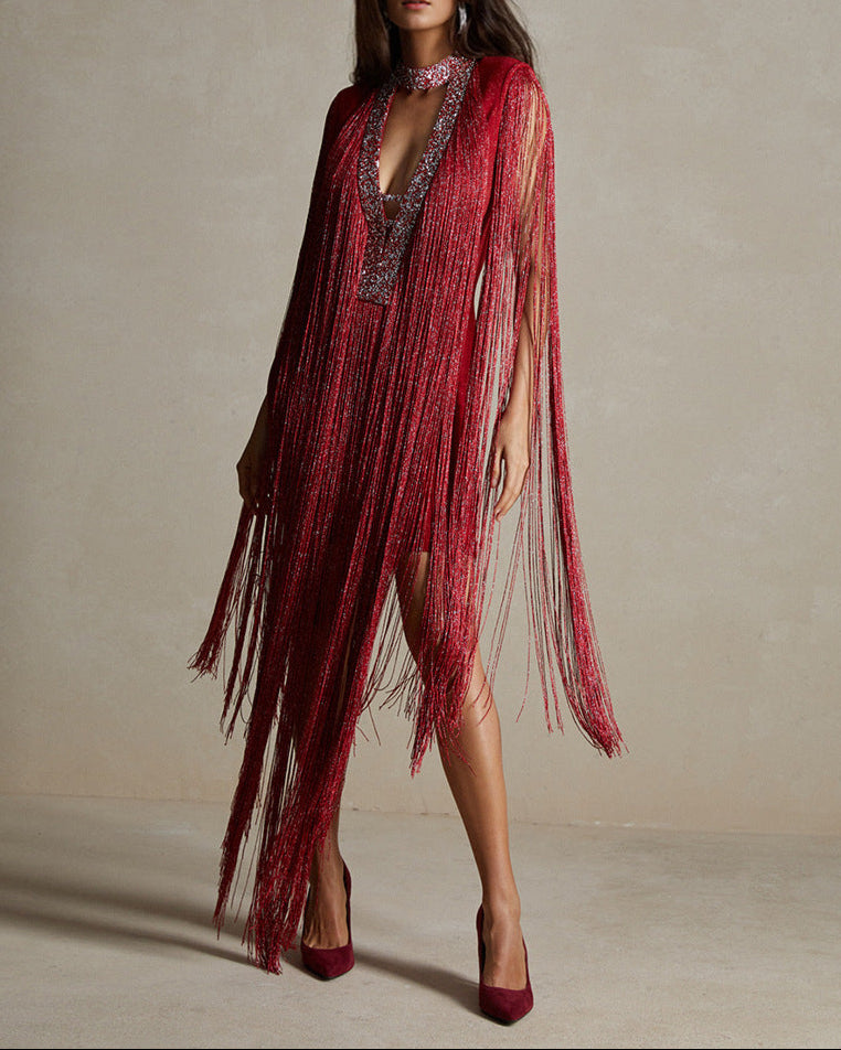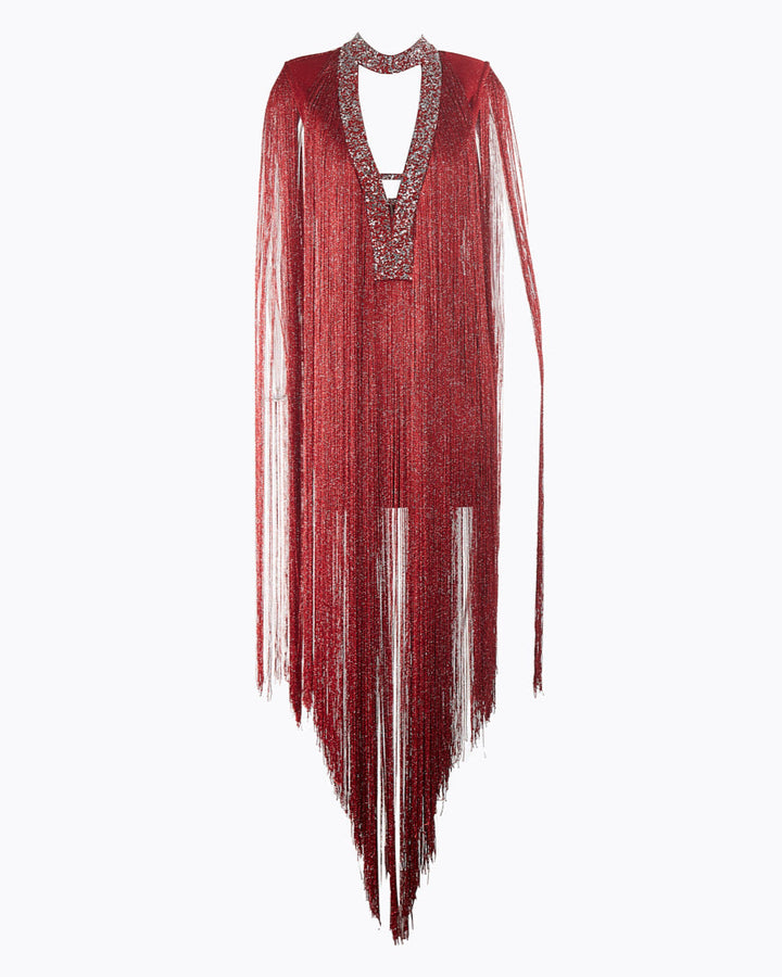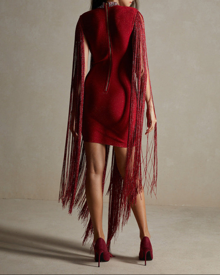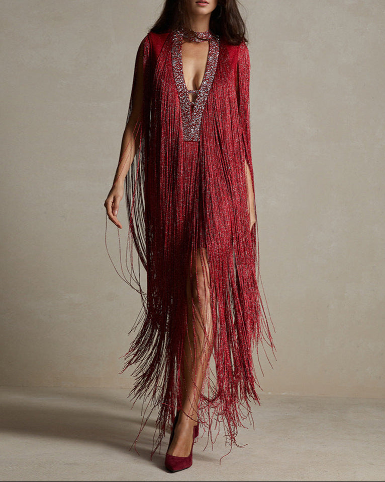 Steal the spotlight in this dress, featuring a daring, deep neckline, all-over crystal embellishments, and a cape with sparkling tassels that sway with every step. A bold blend of sexiness and elegance.