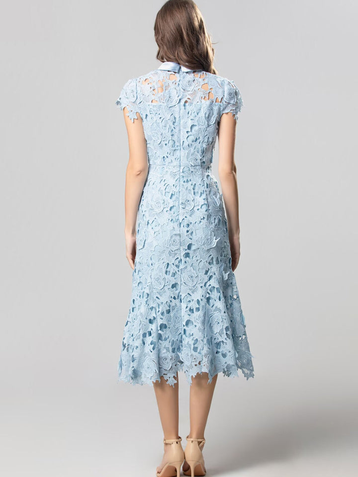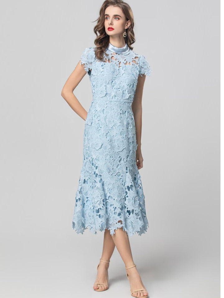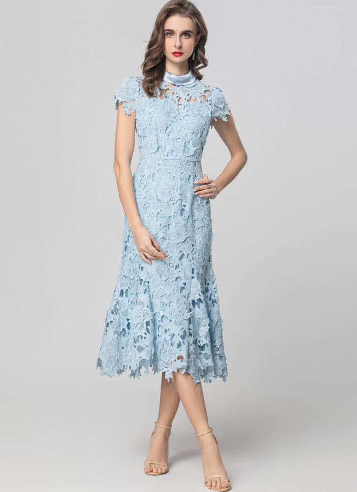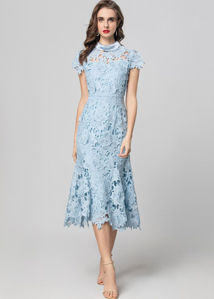An elegant sky blue trumpet-pattern dress crafted from intricate floral lace, featuring a scalloped hem and a chic high neckline. This feminine design is perfect.