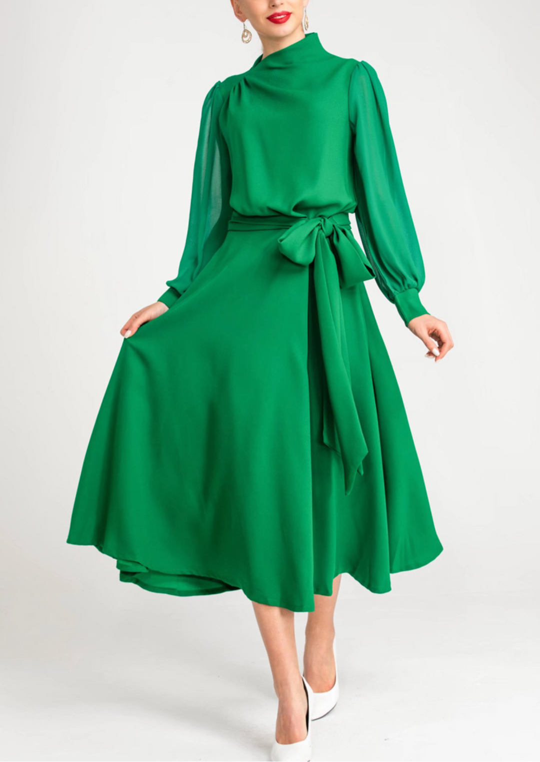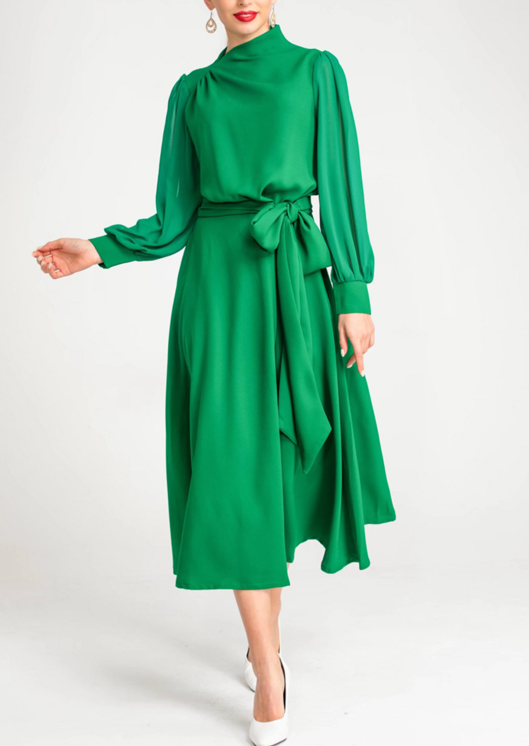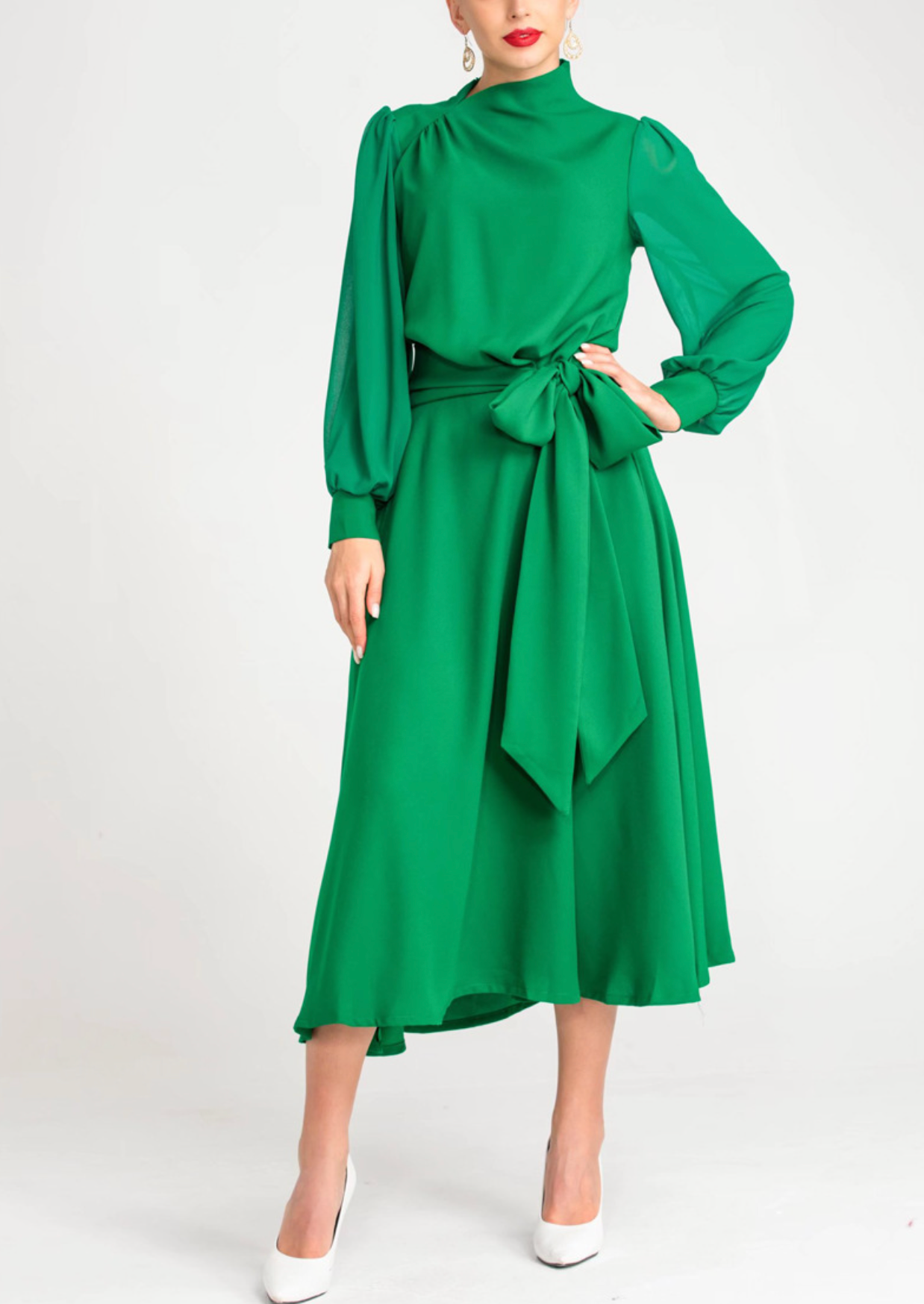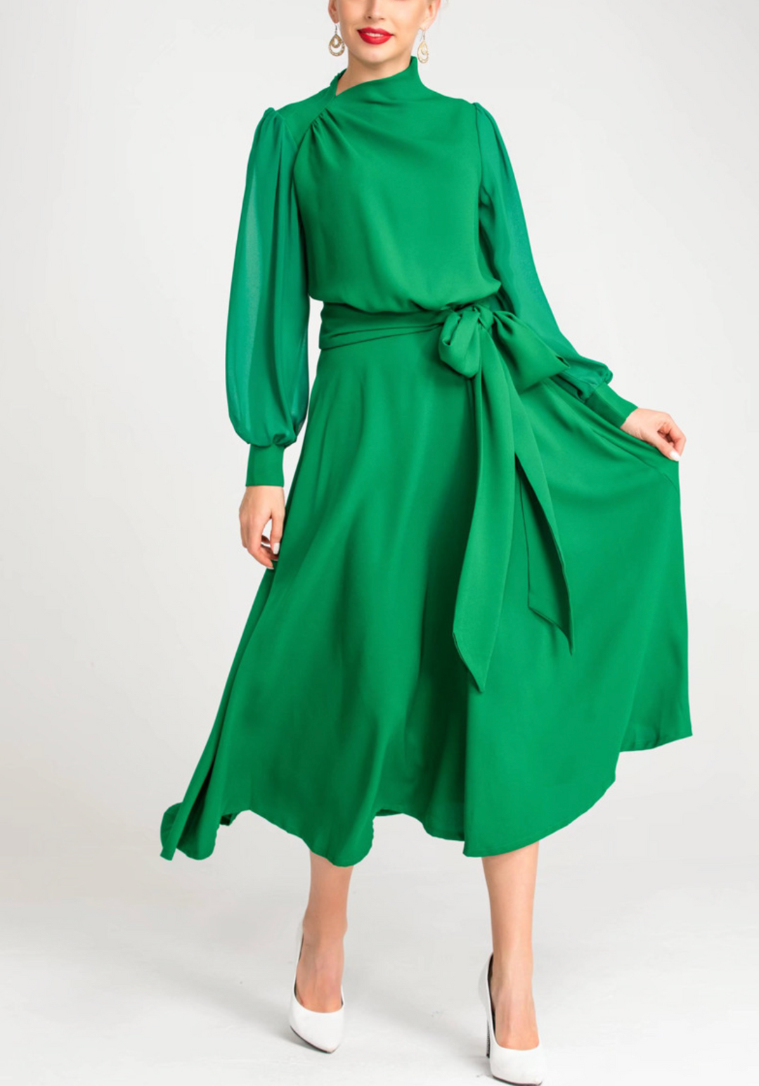 Elegantly crafted in a rich emerald green, this midi dress features a high neckline, voluminous long sleeves, and a flowing A-line silhouette. The wide waist tie adds a flattering, cinched shape—perfect for sophisticated gatherings or chic daytime events.