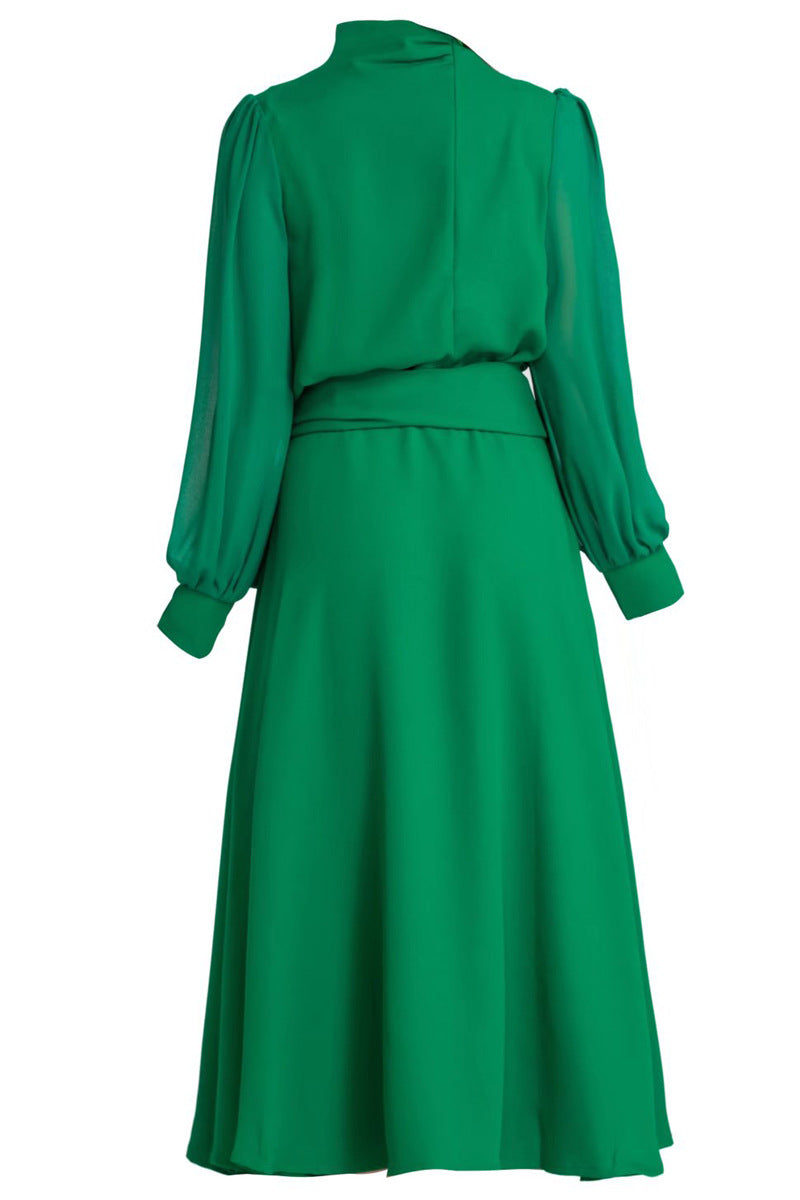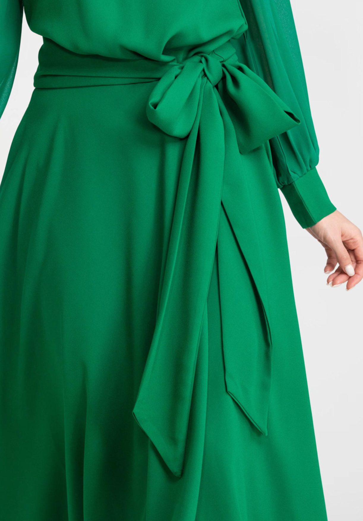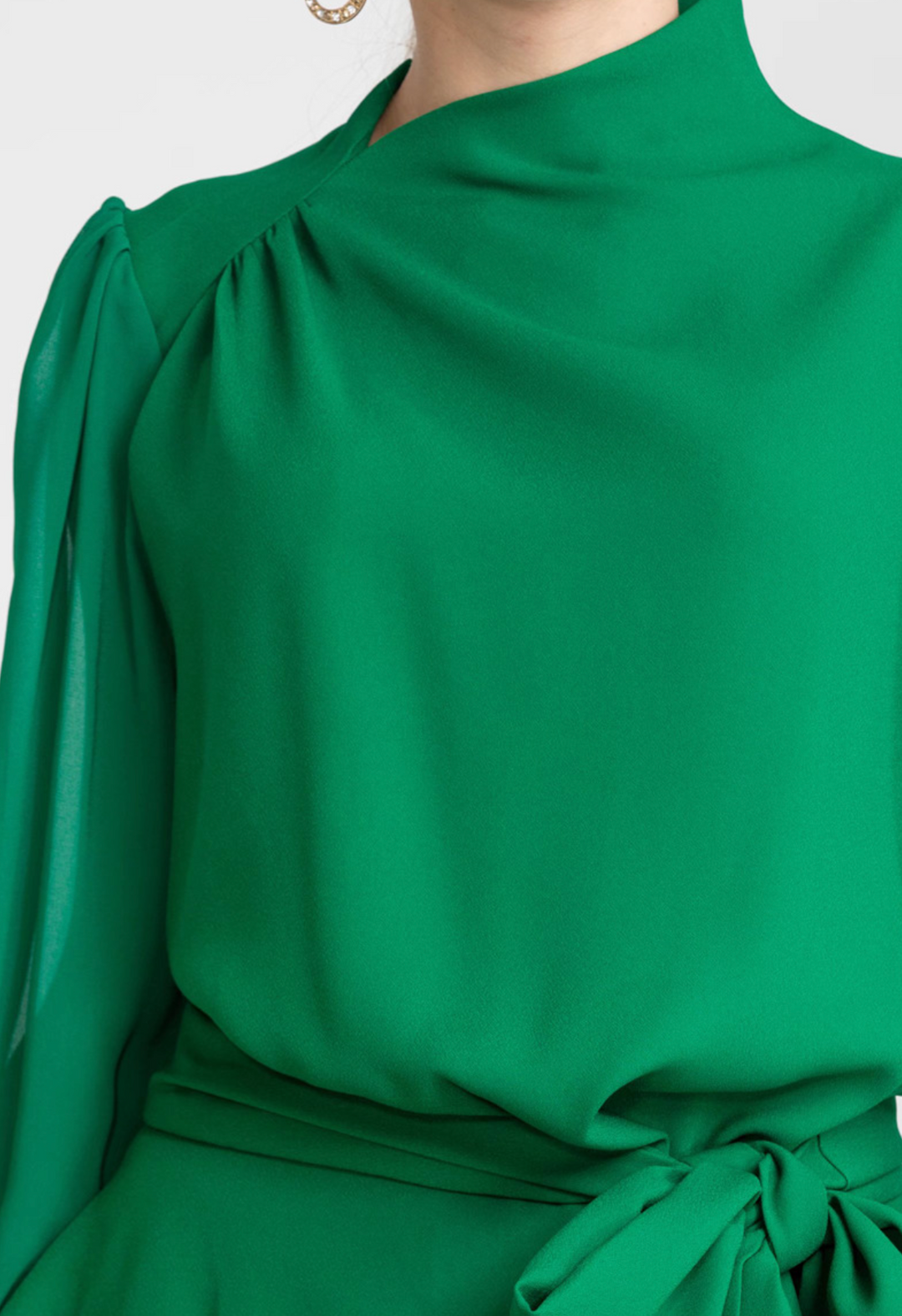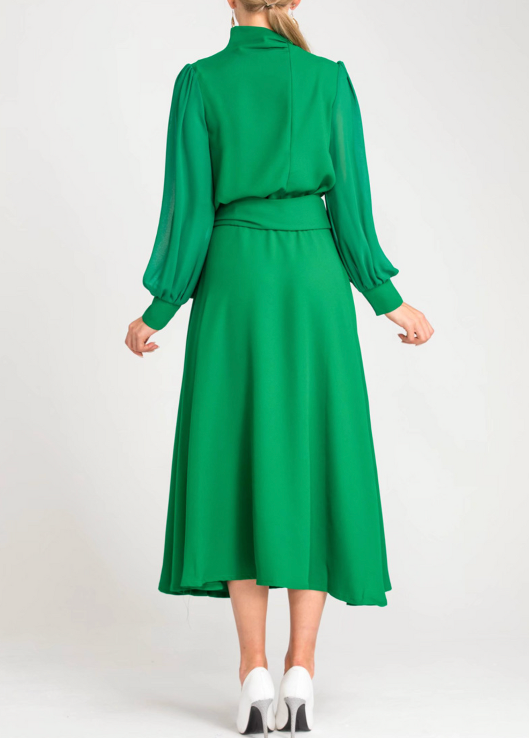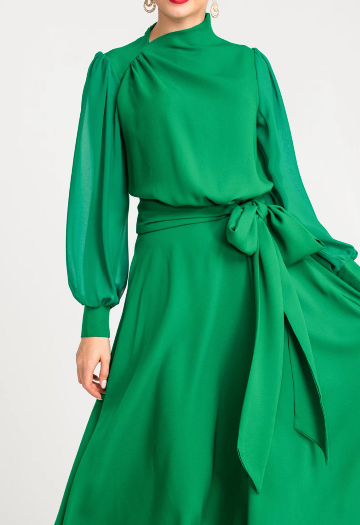 Elegantly crafted in a rich emerald green, this midi dress features a high neckline, voluminous long sleeves, and a flowing A-line silhouette. The wide waist tie adds a flattering, cinched shape—perfect for sophisticated gatherings or chic daytime events.