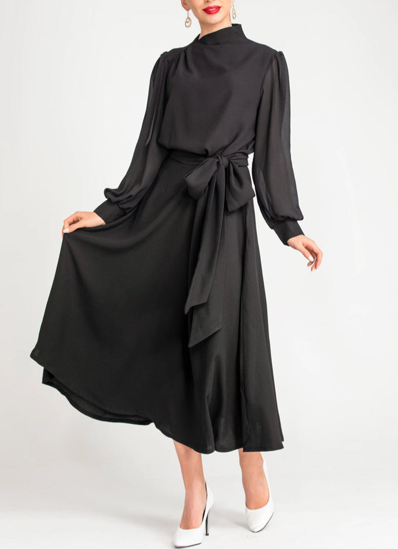 long-sleeve midi dress with high neck and waist tie – EMERA