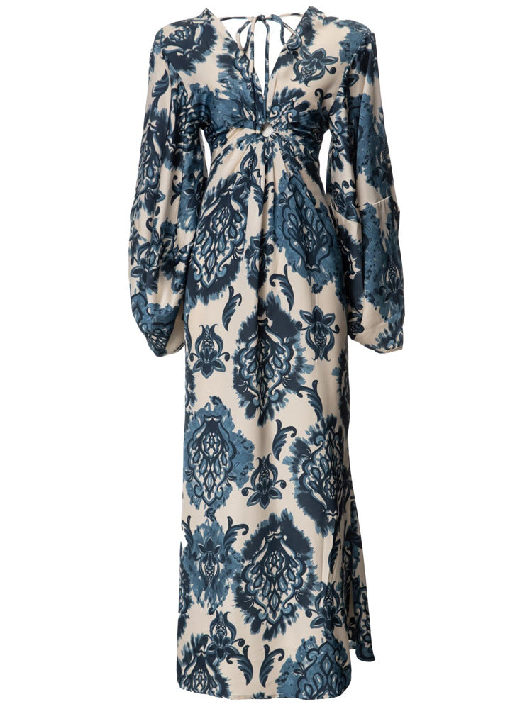 A stunning midi dress with long, wide sleeves, a stylish draped waist, and a front slit. Its sleek and modern design makes it perfect for elegant evenings and upscale events.