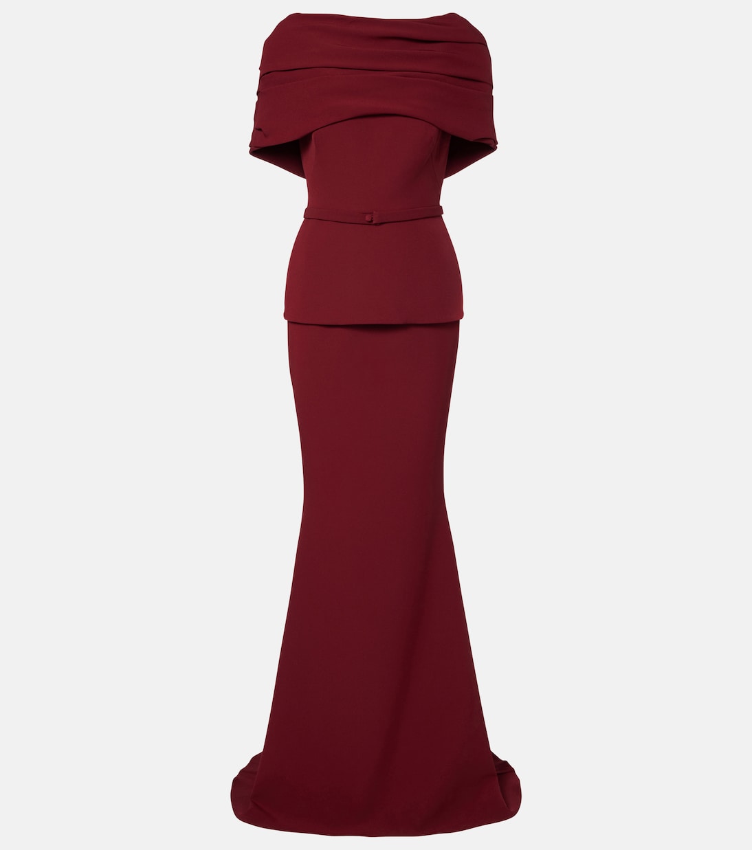 A refined wine-red gown featuring an off-shoulder layered neckline and a sculpted peplum waist. The fitted mermaid silhouette flows gracefully to the floor, combining timeless elegance with modern structure — ideal for evening galas or sophisticated celebrations.