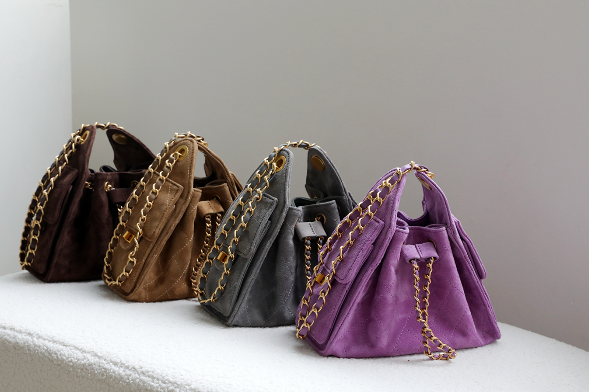 A chic bucket bag crafted in soft quilted suede, designed with a drawstring closure and elegant gold-tone chain detailing. The structured yet relaxed silhouette is finished with a mixed chain-and-suede shoulder strap, adding a luxurious touch to everyday styling. Perfect for elevating casual looks or complementing refined outfits with effortless sophistication.
