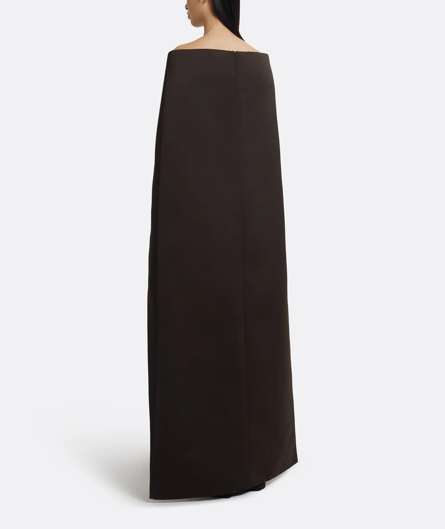 A sleek black strapless jumpsuit paired with a dramatic satin cape overlay, creating a refined balance of minimalism and statement design. Perfect for evening events where elegance meets modern edge.