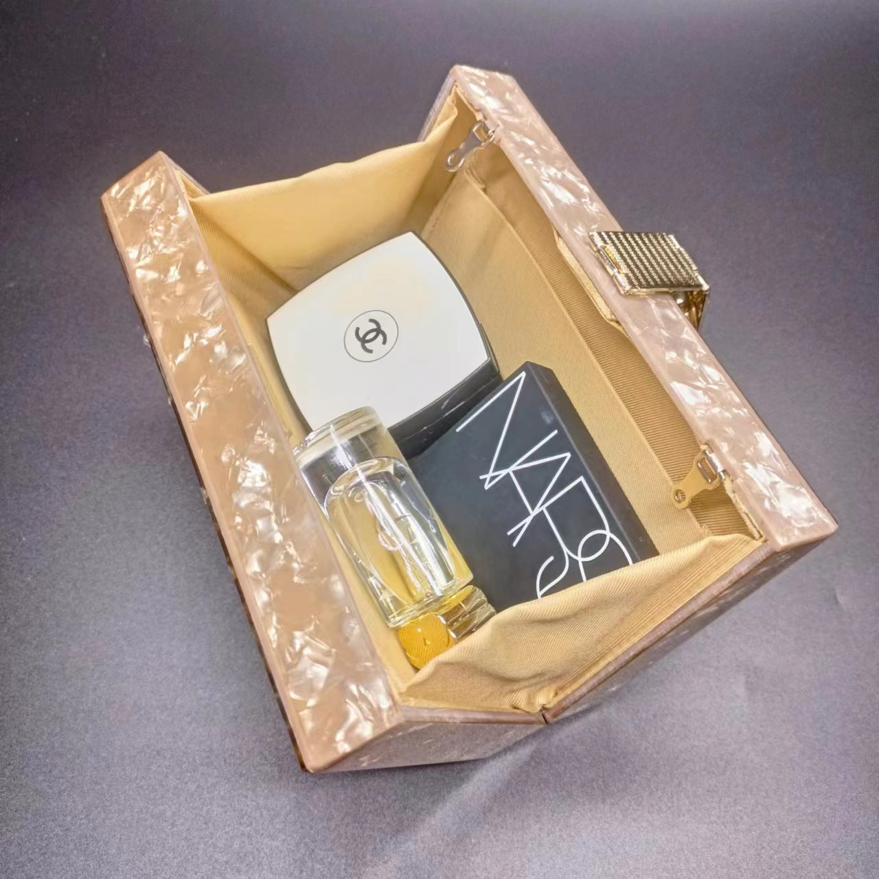An exquisite box clutch adorned with radiant crystal petals and a gold floral lock charm. Crafted from marbled acrylic, it brings a touch of opulence to any look.
