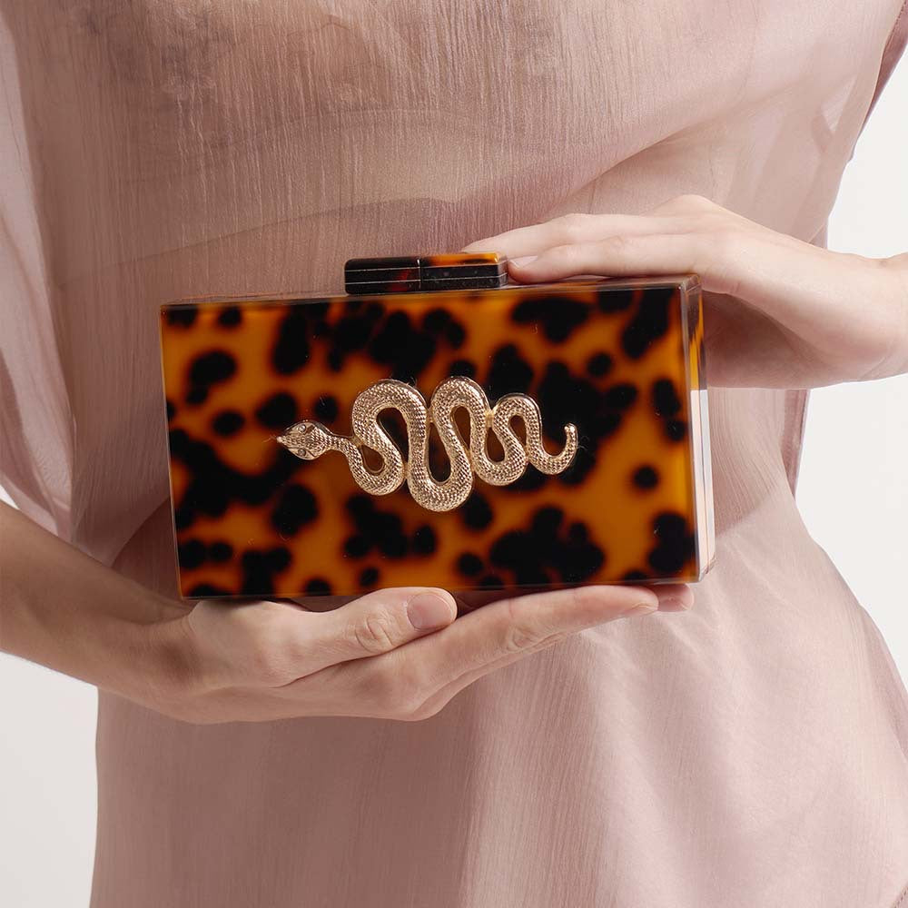 An elegant rectangular clutch crafted from bold tortoiseshell acrylic, embellished with a gold snake motif. Perfect for a look that exudes luxury and confidence.