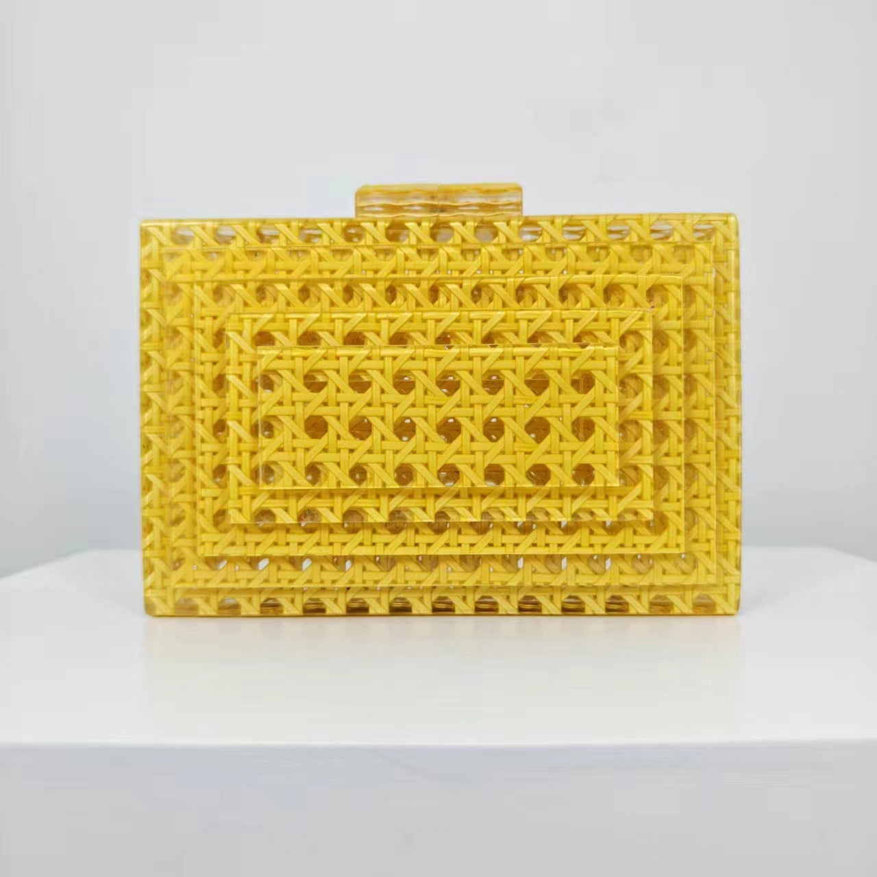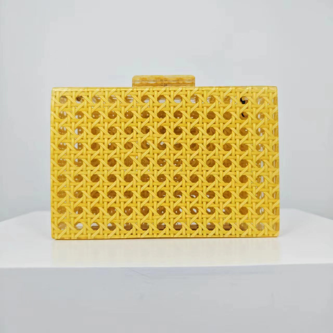 Vibrant yellow rectangular clutch featuring a geometric woven acrylic design and a round beaded top handle—an artistic statement piece that adds a pop of color and texture to any outfit.