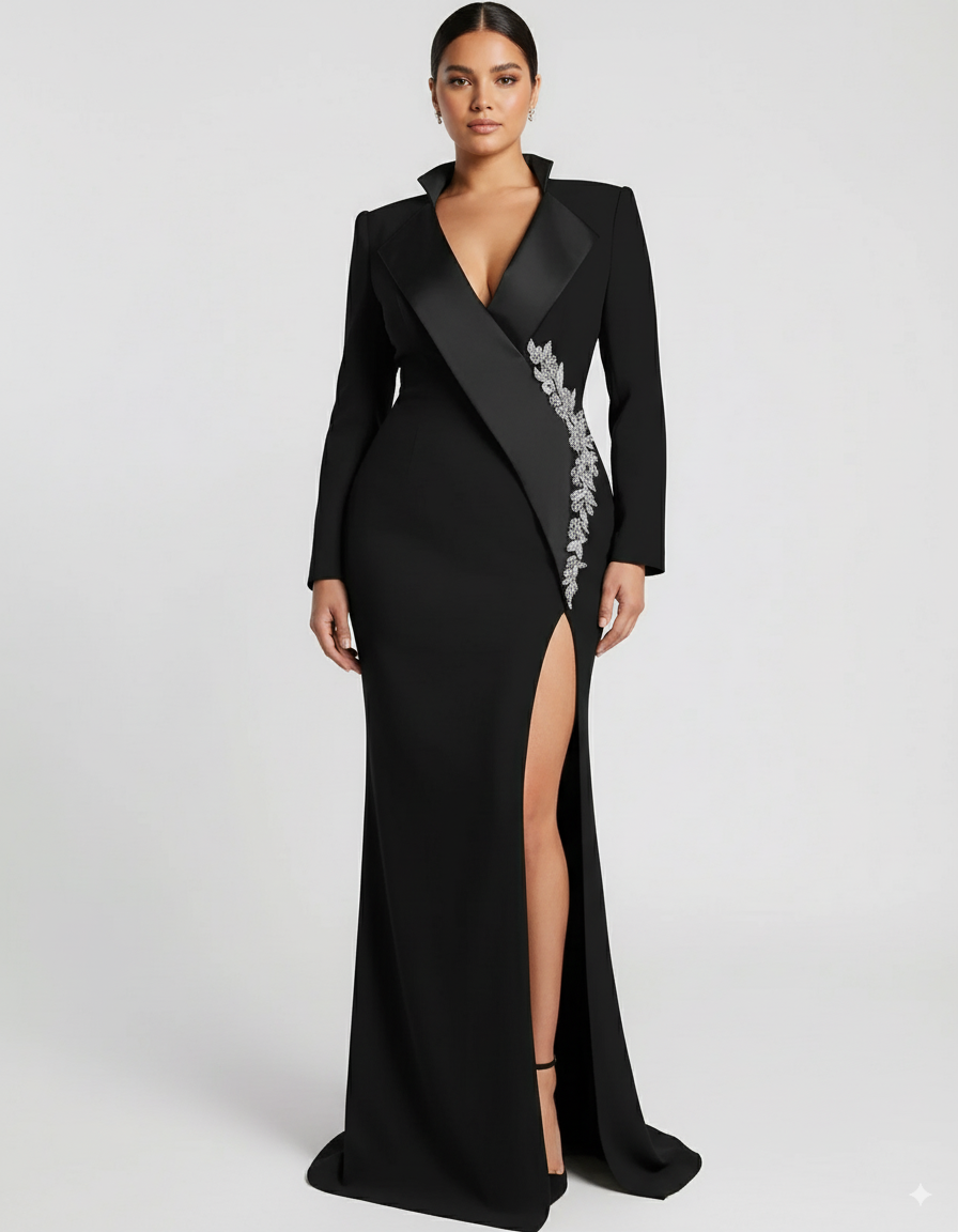 Long Sleeve Blazer-Inspired Gown with Lace Detail and Thigh Slit - VERA-1