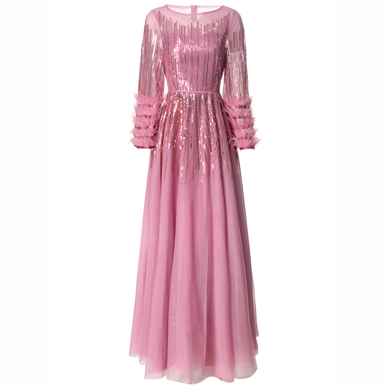 Shine with an unforgettable look in this stunning tulle dress embellished with sequins. It features a sheer neckline, shimmering vertical embroidery, cap sleeves with eye-catching feather detailing, and a long, elegant skirt.