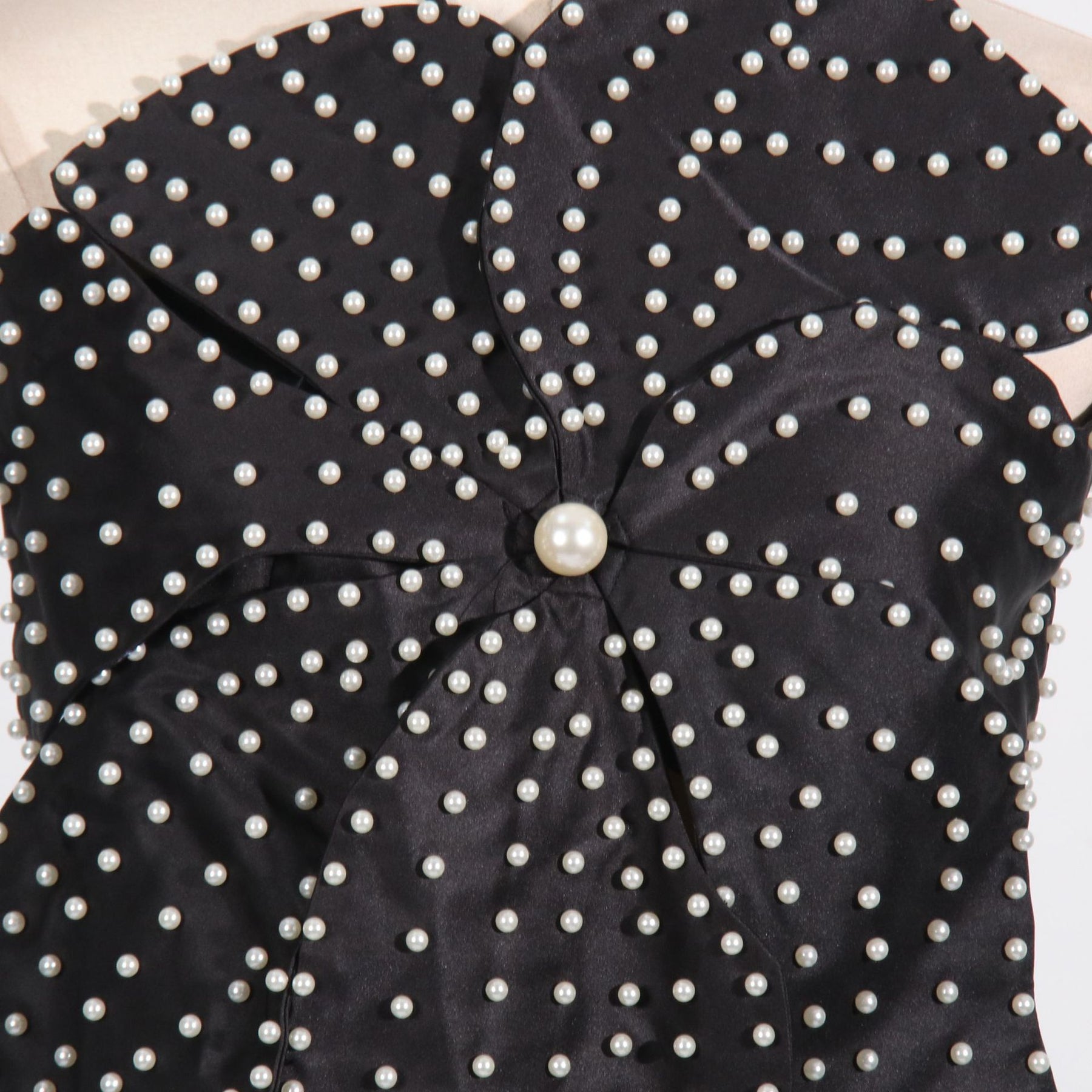 A striking black halter top sculpted in a floral petal silhouette, adorned with delicate pearl embellishments and a statement center pearl. Designed to contour the body with elegant drama, this piece blends couture-inspired detailing with modern femininity—perfect for evening looks and elevated occasions.