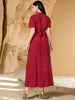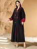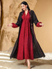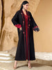 A refined two-piece ensemble featuring a deep red jacquard short-sleeve dress paired with a flowing black open abaya. The contrast of textures and tones makes it perfect for both elegant evenings and festive occasions.