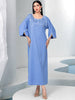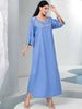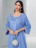 Shine with elegance in this soft blue column dress, featuring a relaxed fit, three-quarter-length sleeves, and delicate beaded embroidery along the neckline and sleeves. An elegant choice.