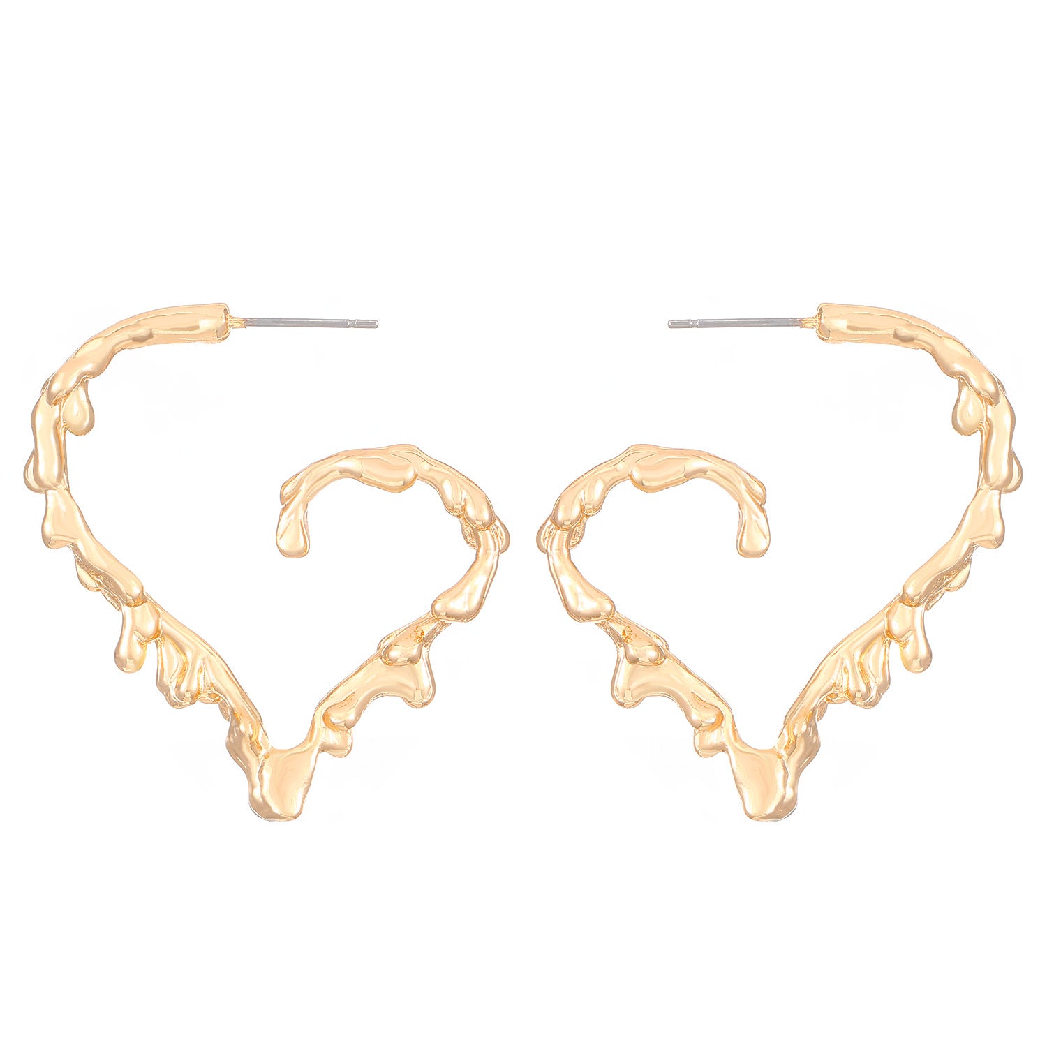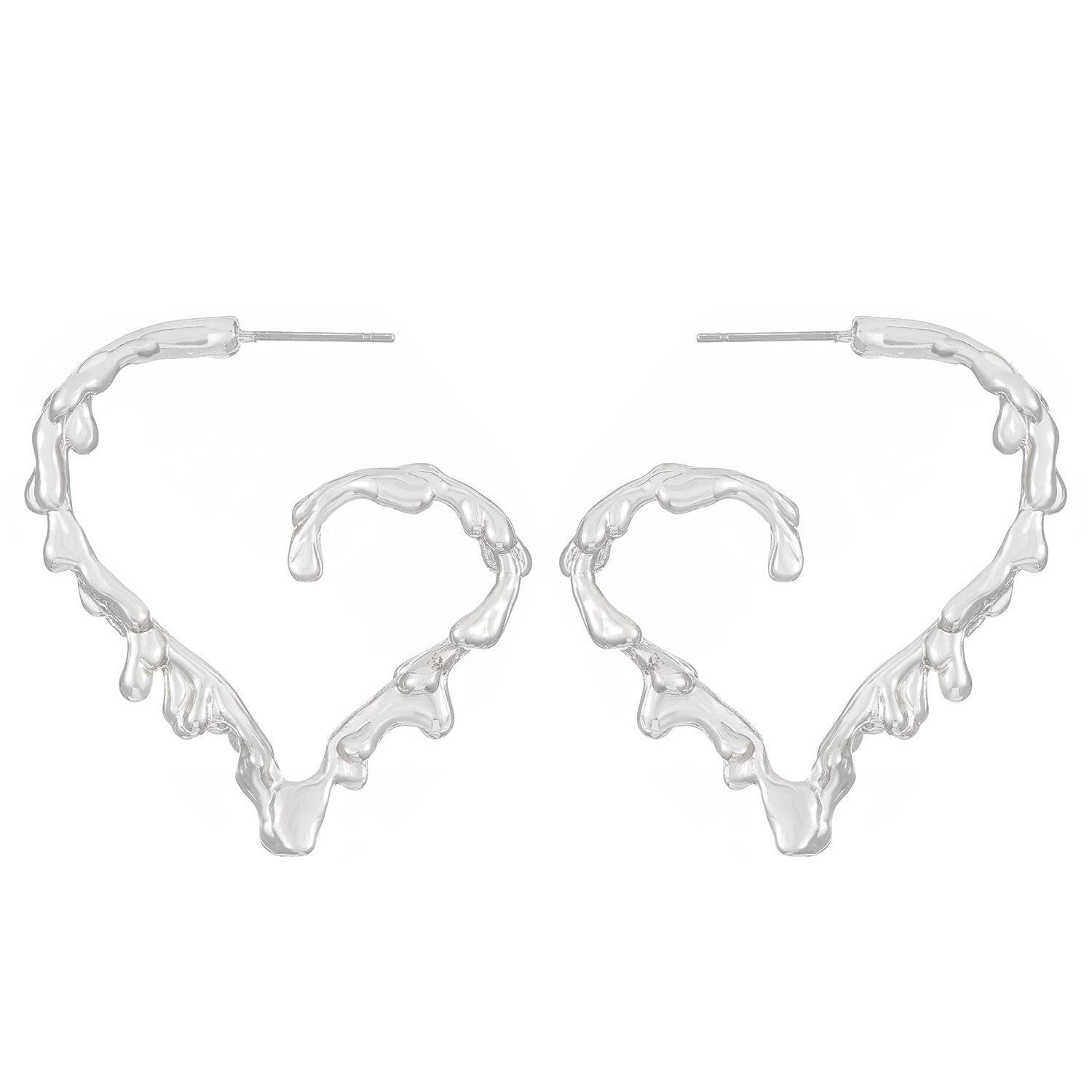 These heart-shaped hoop earrings feature a molten metal-inspired design that exudes bold romance and artistic flair. Crafted in both gold and silver finishes, the textured surface mimics flowing metal, adding a sculptural and contemporary edge to a classic heart silhouette. Lightweight yet eye-catching, these statement hoops are perfect for elevating everyday looks or adding a touch of drama to evening wear.