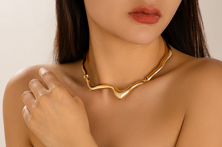 A sculptural necklace featuring a soft, flowing metal design that hugs the neckline with a contemporary artistic touch, blending abstract design with polished sophistication. Available in gold, silver, or two-tone, it adds a contemporary touch to simple or evening looks. Designed to be comfortable as a choker, the Naya necklace is a distinctive accessory that elevates any look with a contemporary touch.