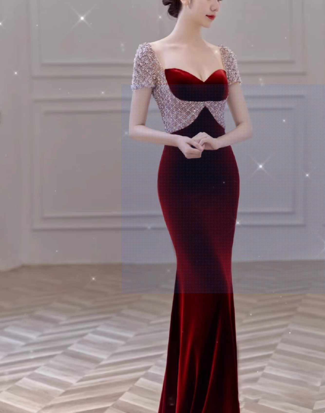Elegant black velvet column dress featuring a structured sweetheart neckline, shimmering crystal-embellished bodice with short sleeves, and a refined silhouette perfect for evening occasions. Fabric name: Velvet Bland Size Bust (cm) Waist (cm) Hips (cm) Length (cm) Slit (cm) 2XS 80 62 89 110 65 XS 84 66 93 111 65 S 88 70 97 112 65 M 92 74 101 113 65