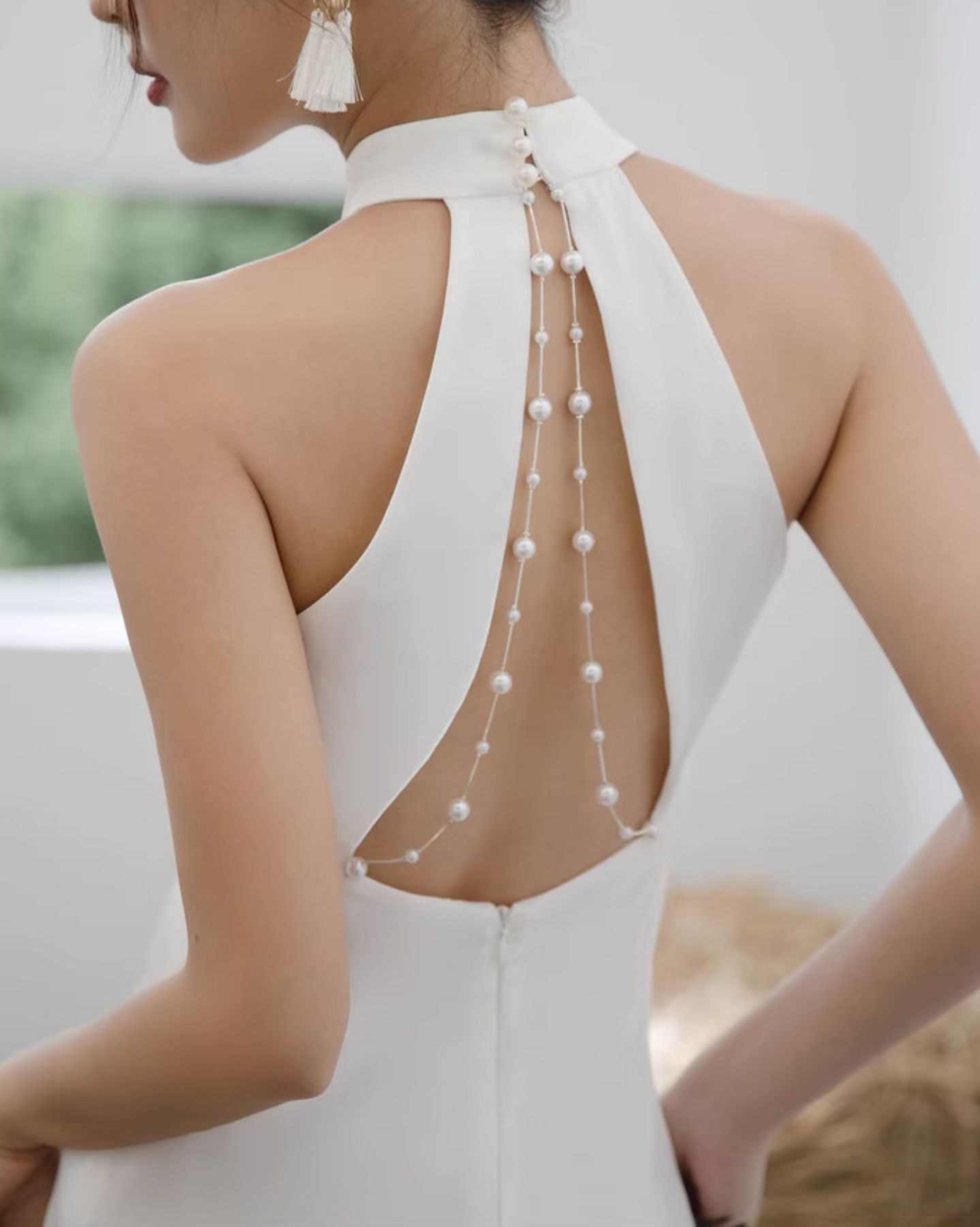 A sleek ivory gown designed with a high halter neckline and column silhouette. Its clean lines and elegant simplicity make it a timeless piece for formal evenings or modern bridal occasions.