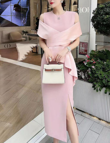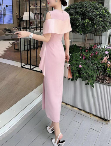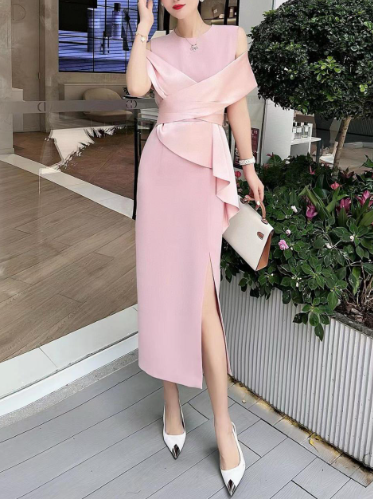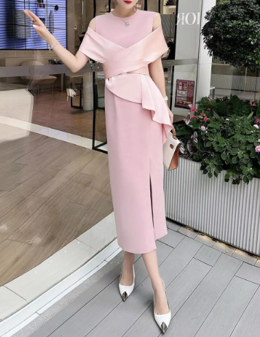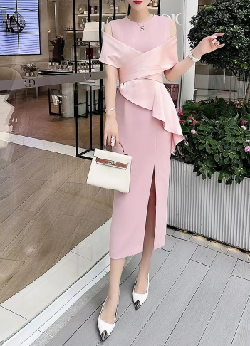 A striking crimson cocktail dress featuring an elegant off-shoulder draped neckline, a cinched wrap-style bodice, and a sculpted side peplum detail. Finished with a sleek front slit for a modern, feminine silhouette—perfect for evening events, parties, and sophisticated celebrations.