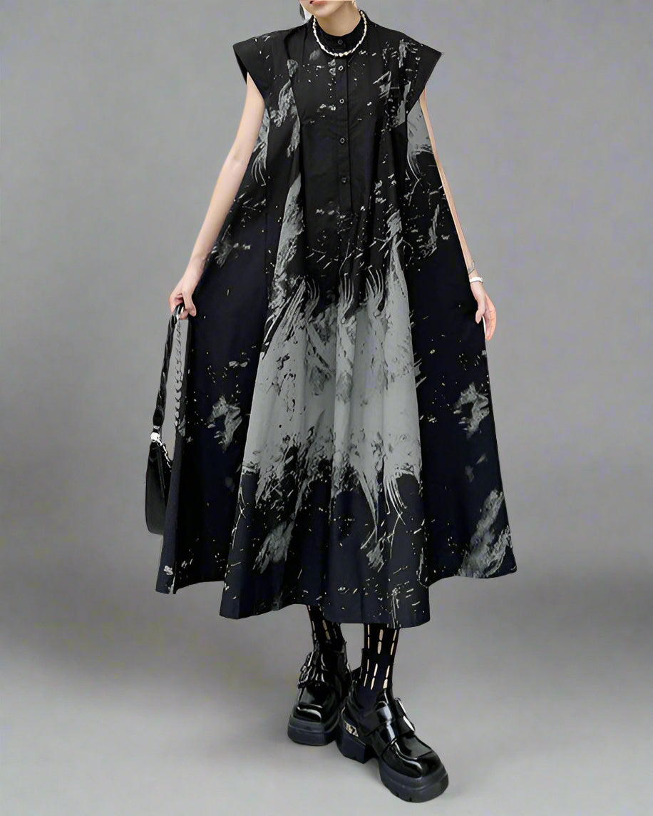 A distinctive sleeveless dress featuring a loose, flowy design and a black and white abstract print. Made from lightweight fabric and a collar, it blends modern art with simple elegance.
