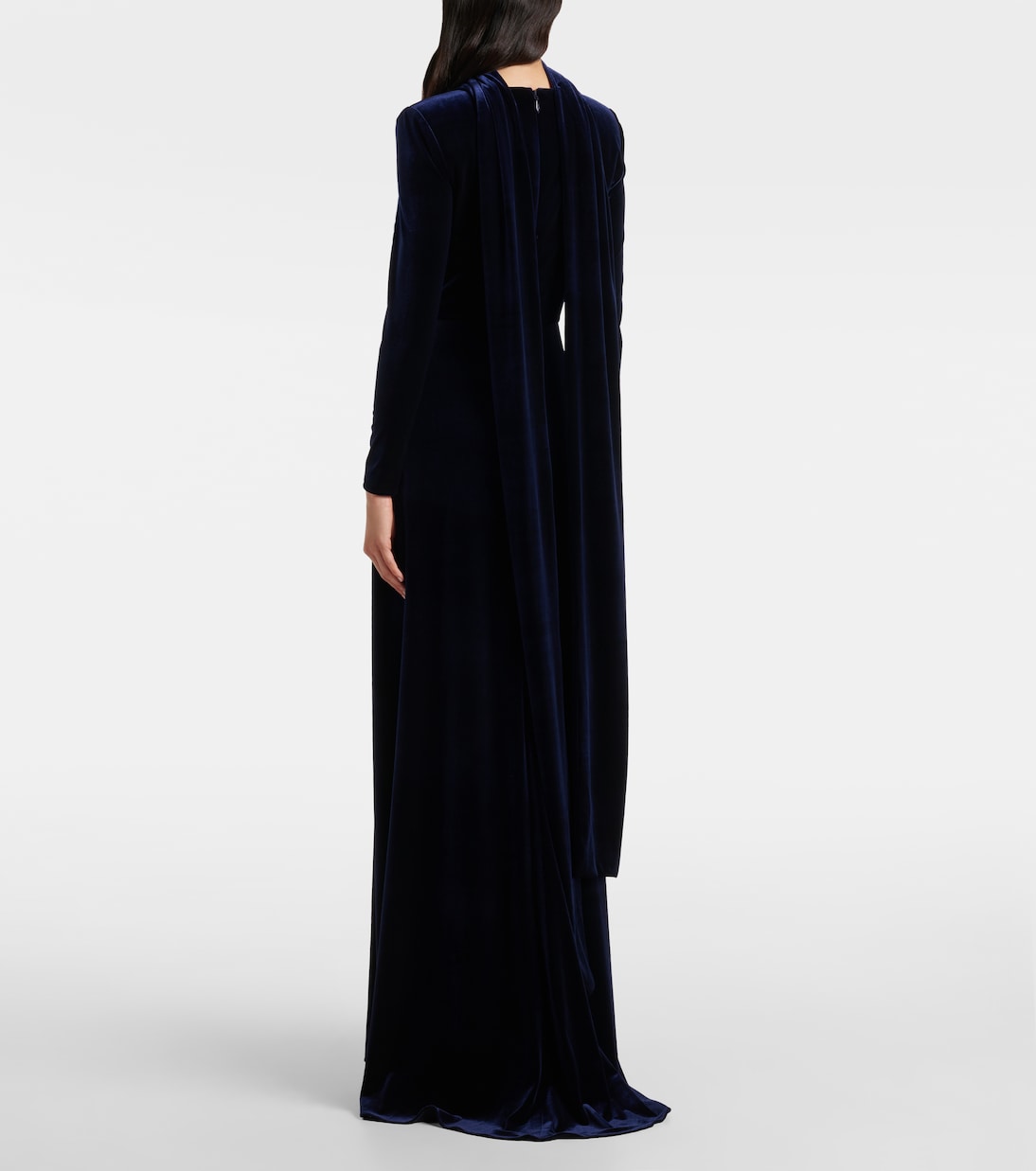Long-sleeve velvet gown with square neckline and draped waist – NOCTURNE