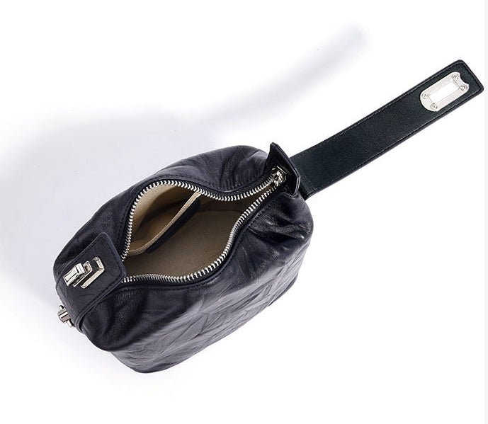 Compact and stylish mini handbag crafted from crinkled textured leather with a structured top handle and metal clasp detail. Perfect for adding modern edge to any outfit.