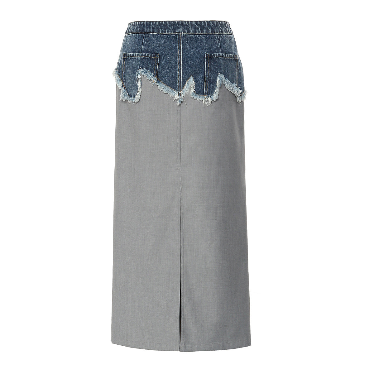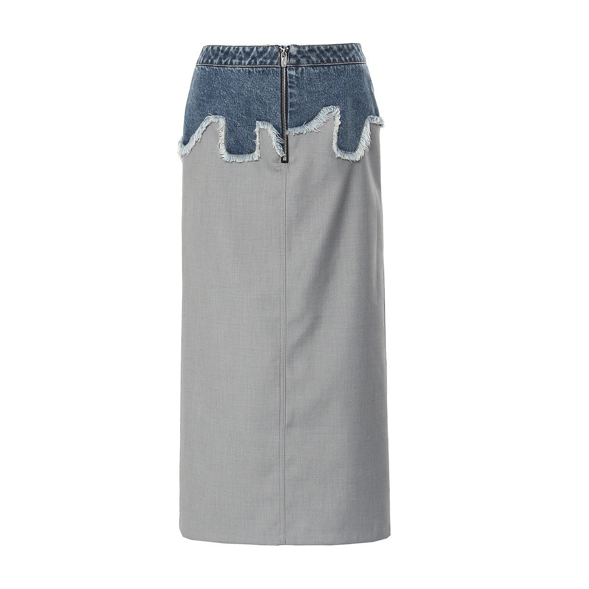 A modern high-waist midi skirt designed with a contrast denim upper panel and raw-edge detailing for a bold, fashion-forward look. The clean straight silhouette balances structure and ease, making it perfect for contemporary day styling or elevated casual outfits.
