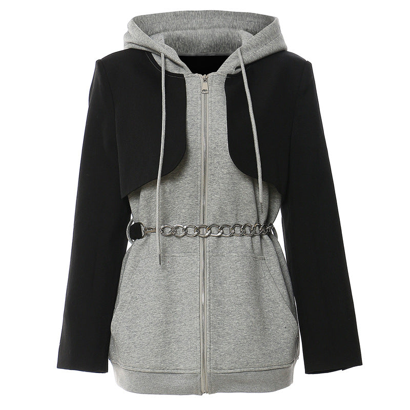 A modern statement hoodie dress blending casual comfort with structured edge. Designed with layered contrast panels, a front zip closure, adjustable hood drawstrings, and a metallic chain belt to define the waist. This contemporary piece delivers an elevated street-style look—perfect for bold everyday outfits and urban styling.