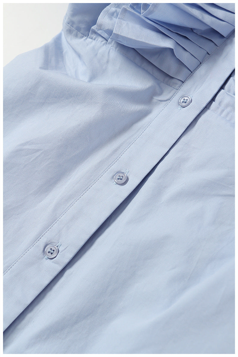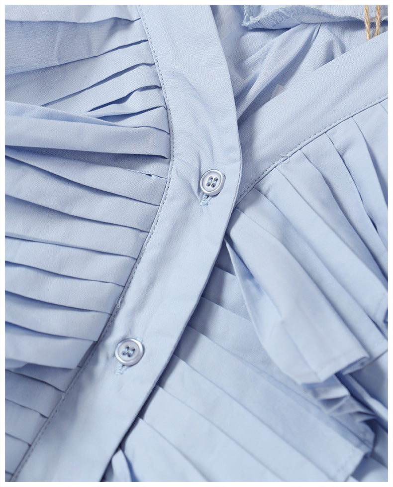 An ethereal white chiffon midi dress featuring soft pleated ruffle sleeves and a flattering V-neckline. Designed with a button-down front and adjustable waist tie, this airy silhouette flows gracefully with every step—perfect for elegant daytime occasions, summer events, or refined resort wear.