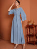 An elegant light blue dress featuring delicate embroidery on the chest and sleeves, with wide cuffs and a softly draped waist for a graceful and feminine silhouette.